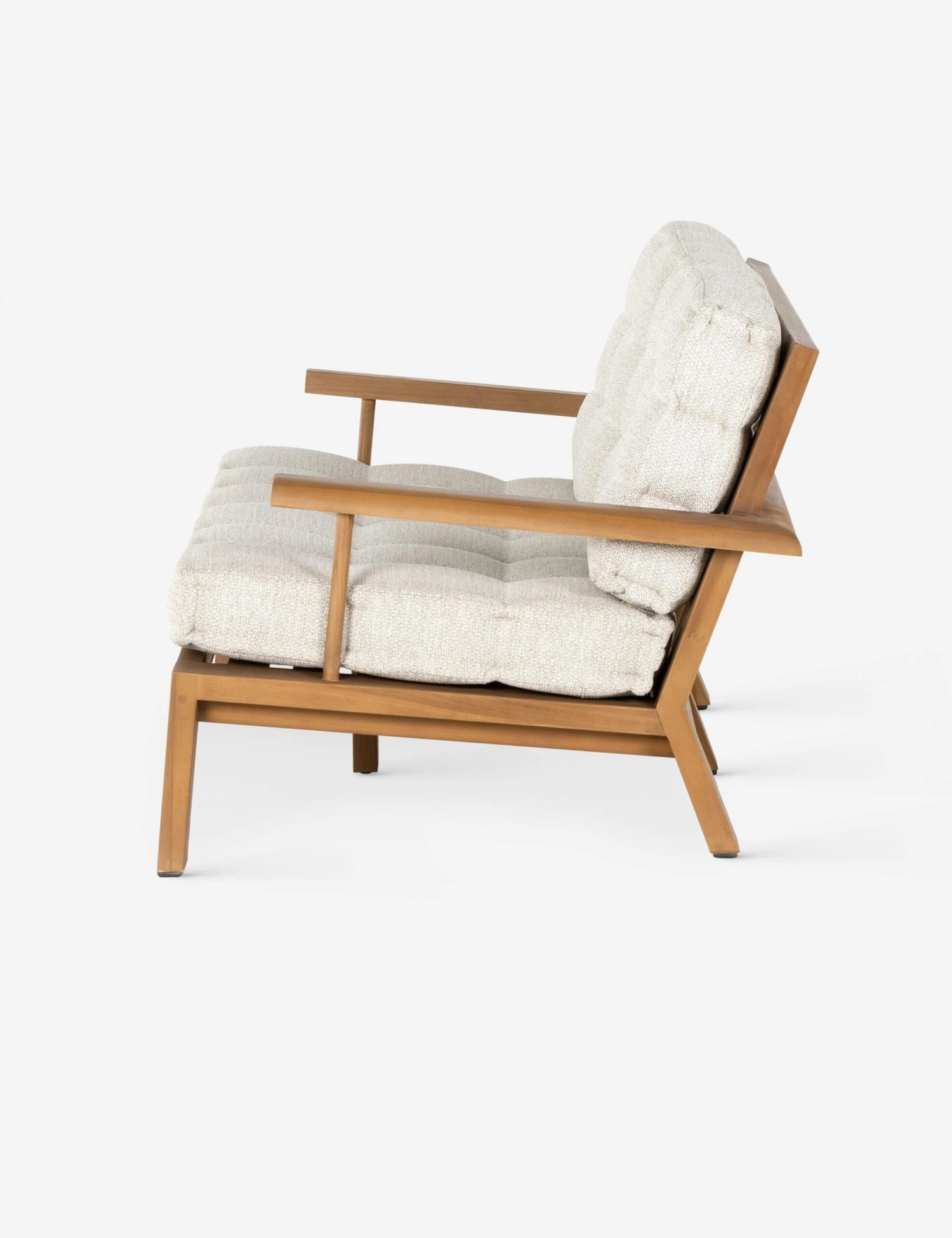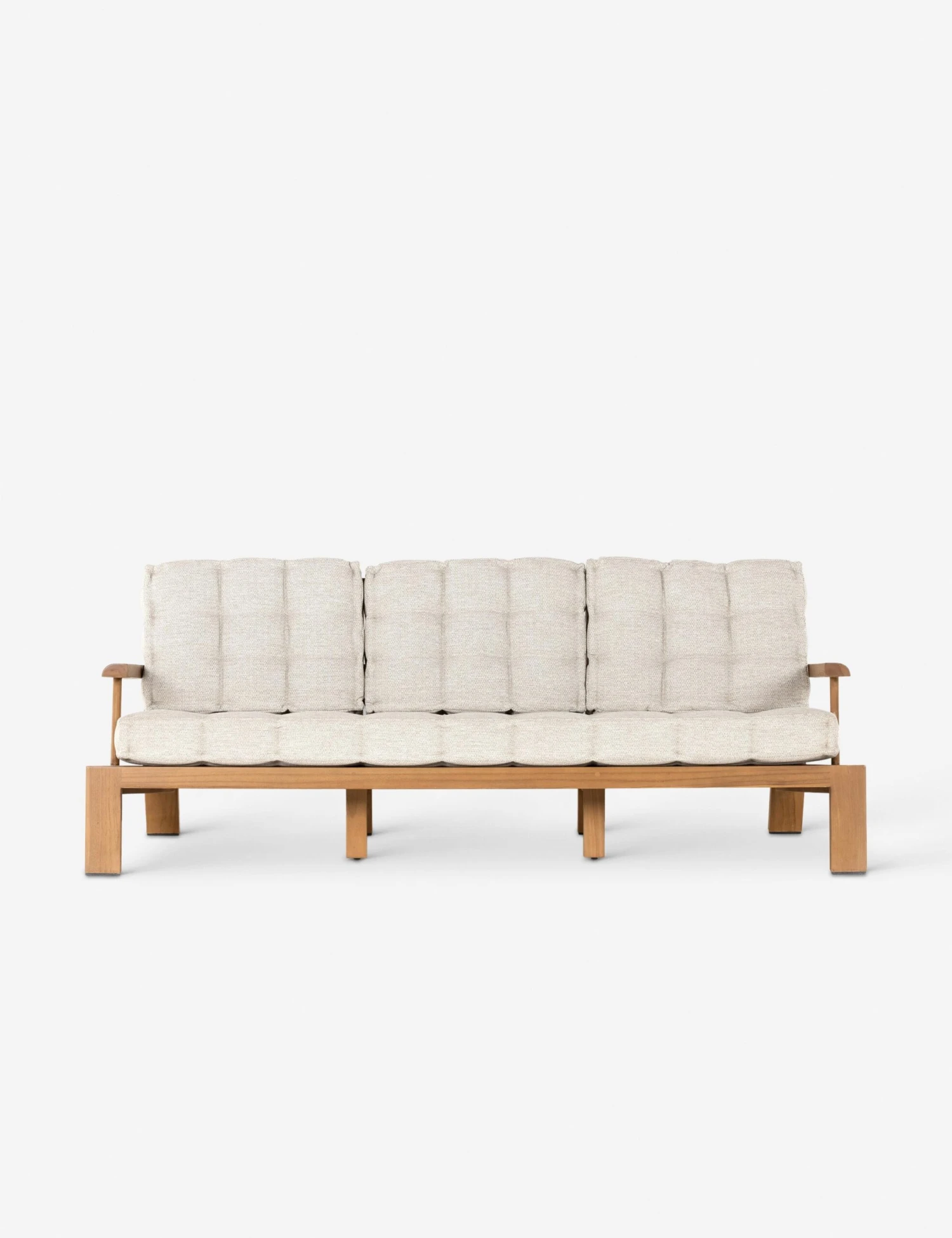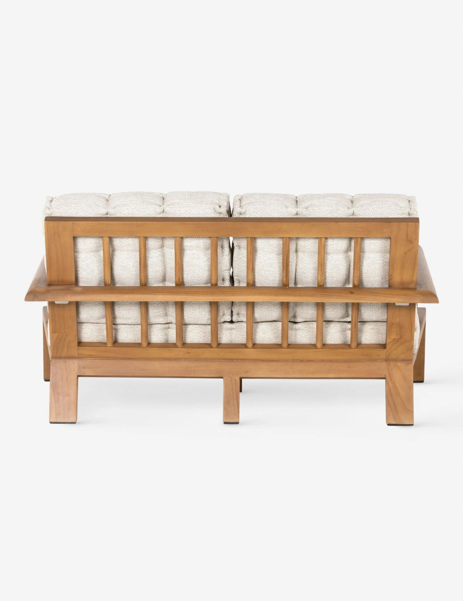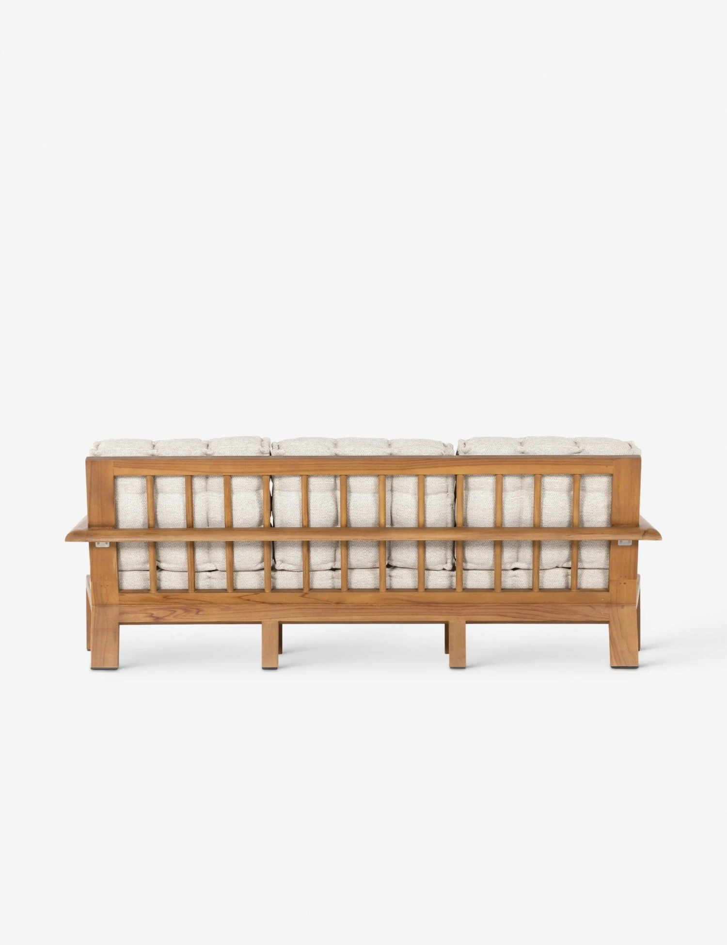 The Amabel sofa is set for a laid-back lounge. The angular teak frame features rounded arms and a spindle back, offering outdoor couch seating with a dashing silhouette. Tufted cushions complete the look for effortless sophistication from sunroom to terrace.