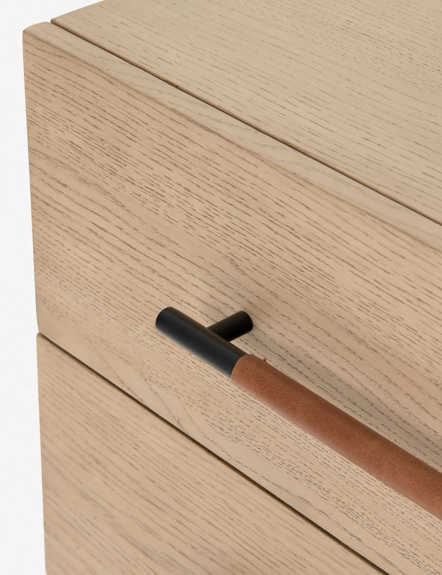 With its clean lines, sandy finish, and leather accents, this dresser brings a refined, minimalist effect to your bedroom. Constructed from solid oak and an oak veneer, it’s complemented by iron hardware and wrapped in tan top-grain leather. Six roomy drawers provide tons of storage space.