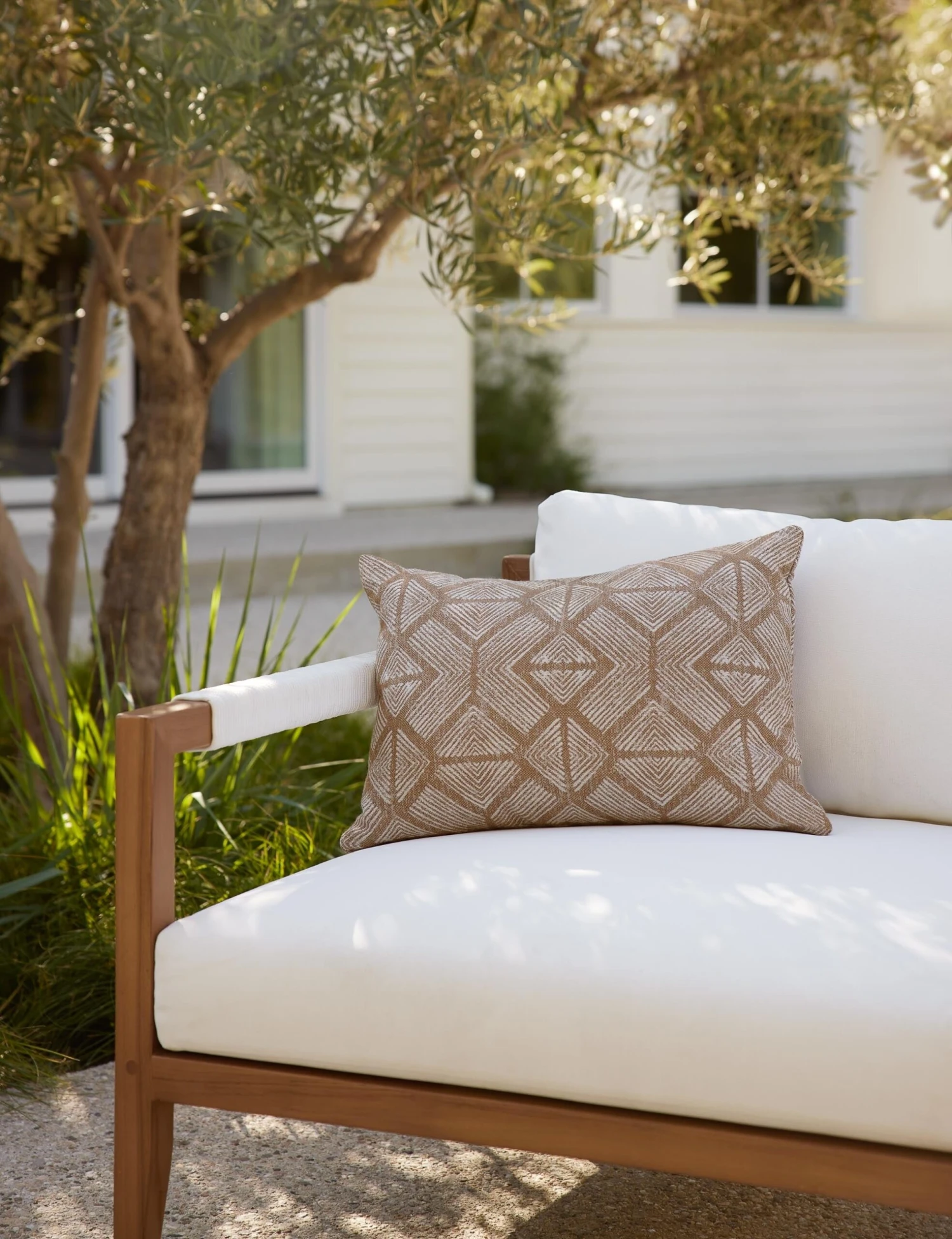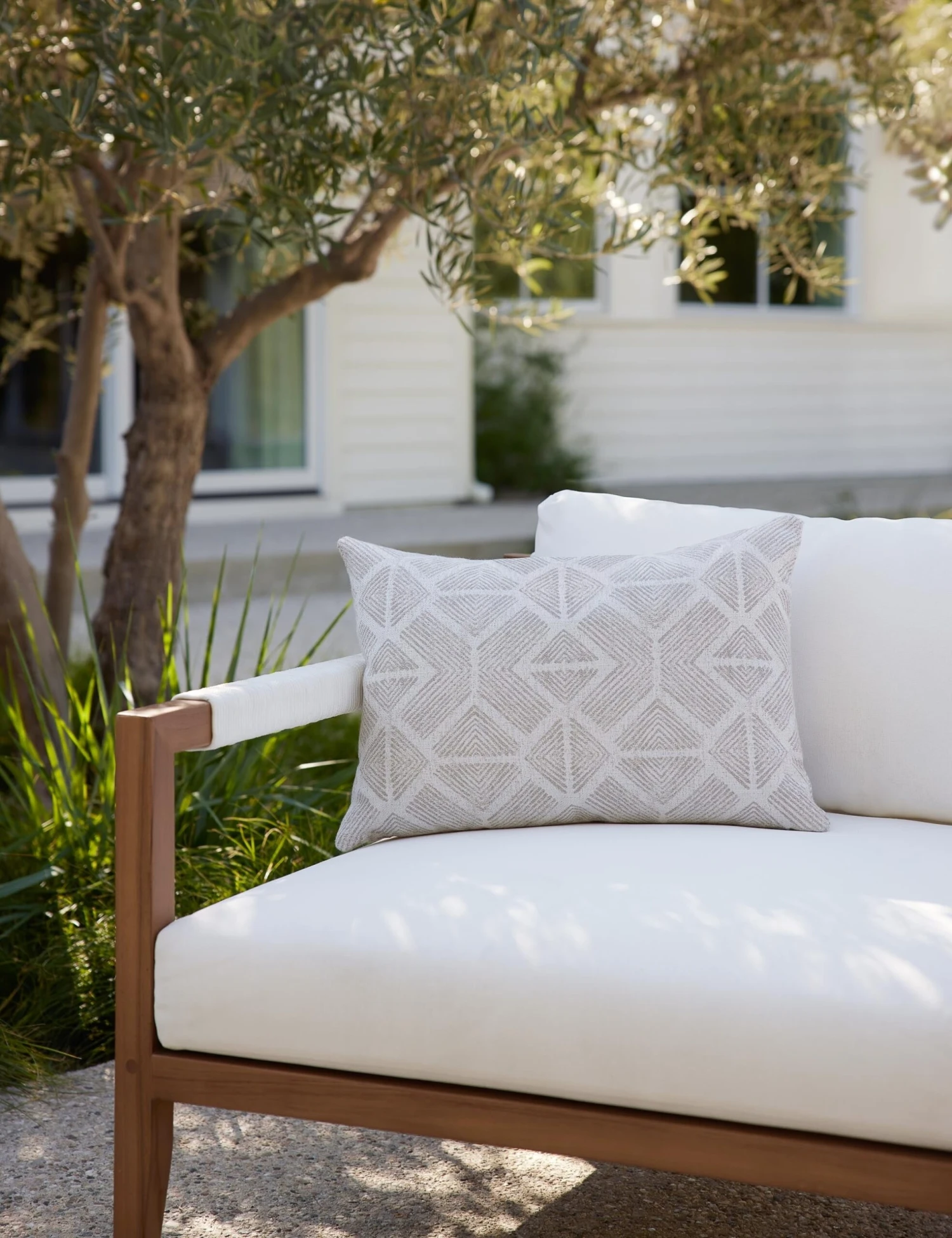 An inviting color palette strikingly softens the tile-inspired pattern of this lumbar throw pillow, making it a great accent to pair with lighter neutral fabrics and wood finishes. Made from a weather-resistant and easy-to-clean fabric, this decorative pillow is super soft, making it perfectly suited for indoor or outdoor styling options.