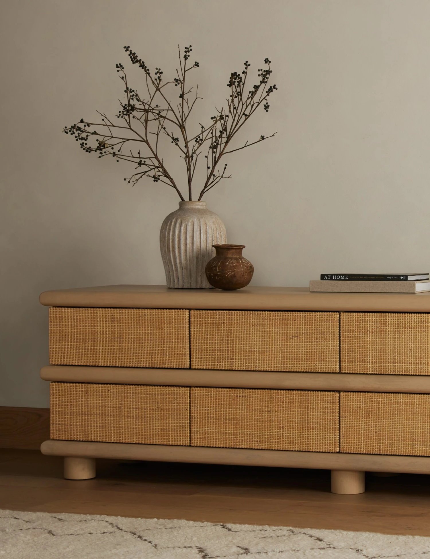 Light-finished mango, rounded lines, and cane drawers inspire a soft tonal look full of textural appeal. With ample storage, rear cutouts, and soft close drawers, this media console is made for practical elegance in your family room or lounge.