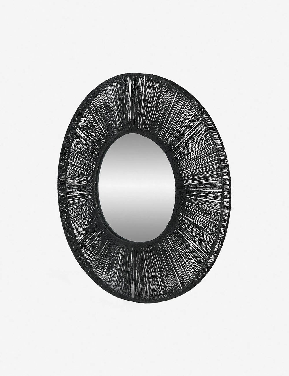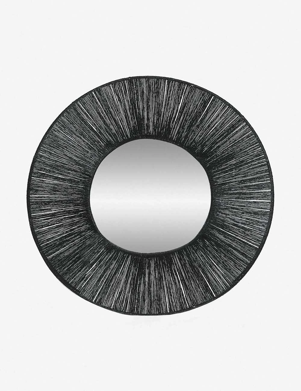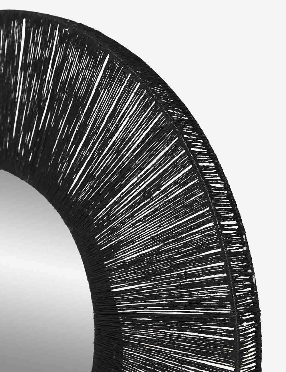 This round framed mirror is a statement-making accent, combining organic appeal with a sleek black color. Twisted jute fibers are tightly woven around a light steel frame to create a textural finish. Hang this round wall mirror above a sideboard, console table, or dresser in a dark finish for a monochromatic look.