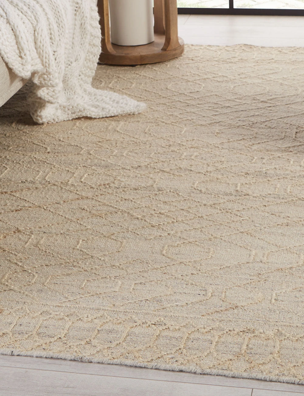 Texture and effortless versatility define this dhurrie-style rug. Handwoven from a natural fiber blend for a uniquely textured look, this area rug shows off a captivating, overstitched trellis pattern.