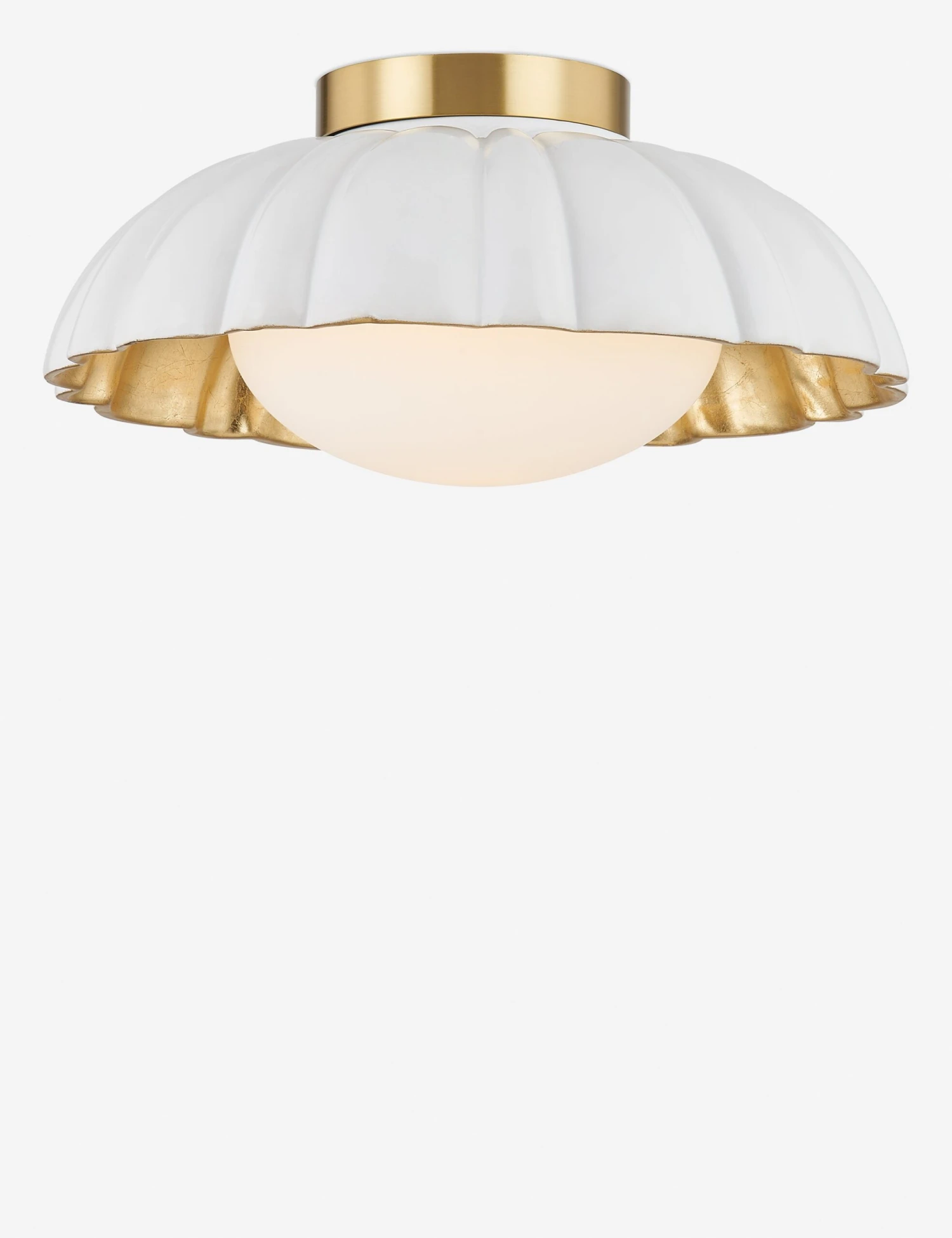 The Coral flush mount brings statement style to a low-profile light fixture. The fluted ceramic shade offers textural intrigue, lined with gold leaf lining for a glamorous finish. The opaque shade casts a beautifully diffused light for ambient illumination from above.