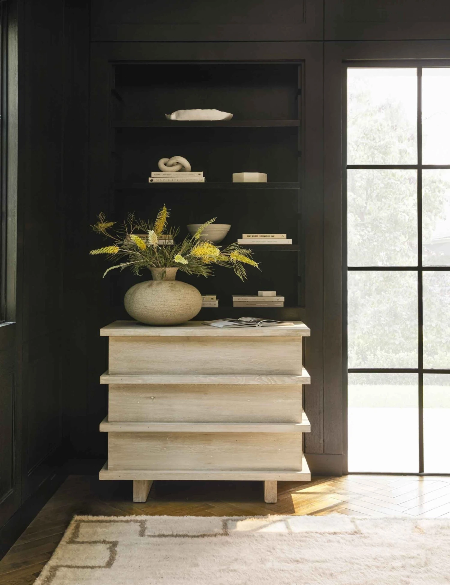 From the neutral gray finish on the reclaimed douglas fir wood, to the edgy modern silhouette—we love it all on this dresser. Three spacious drawers offer plenty of storage, and rectangular plank legs give the piece of bedroom furniture a streamlined, elevated feel. It’s the perfect place to prop your favorite decor and a sculptural table lamp.