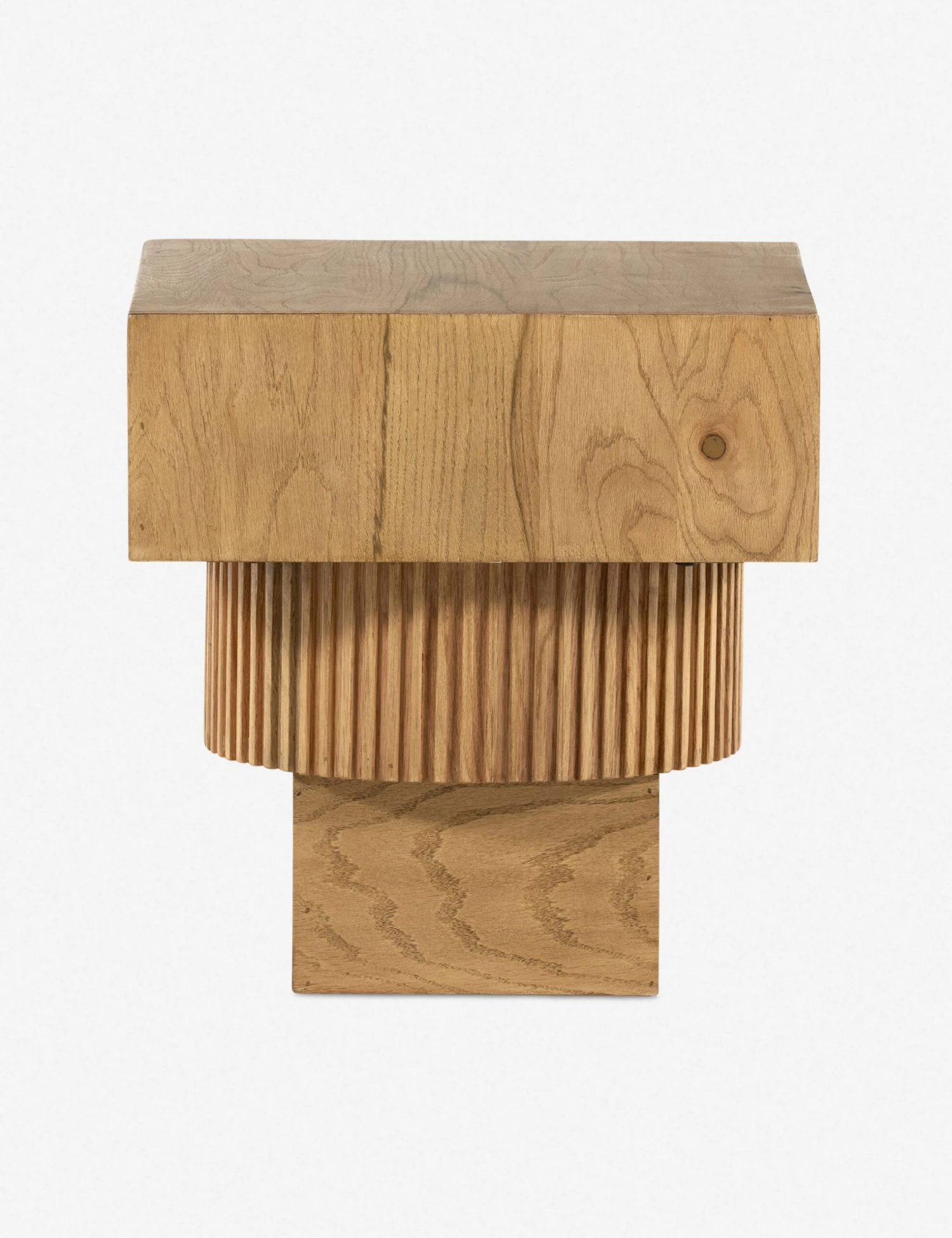 Fashioned from solid oak, this eye-catching end table pairs clean-lined blocks with fluted detailing to offer dynamic visual contrast and evoke a neoclassical column. A warm honey finish augments the natural wood grain, grounding this sculptural side table with an organic feel that will bring a statement-making touch to a collected aesthetic.
