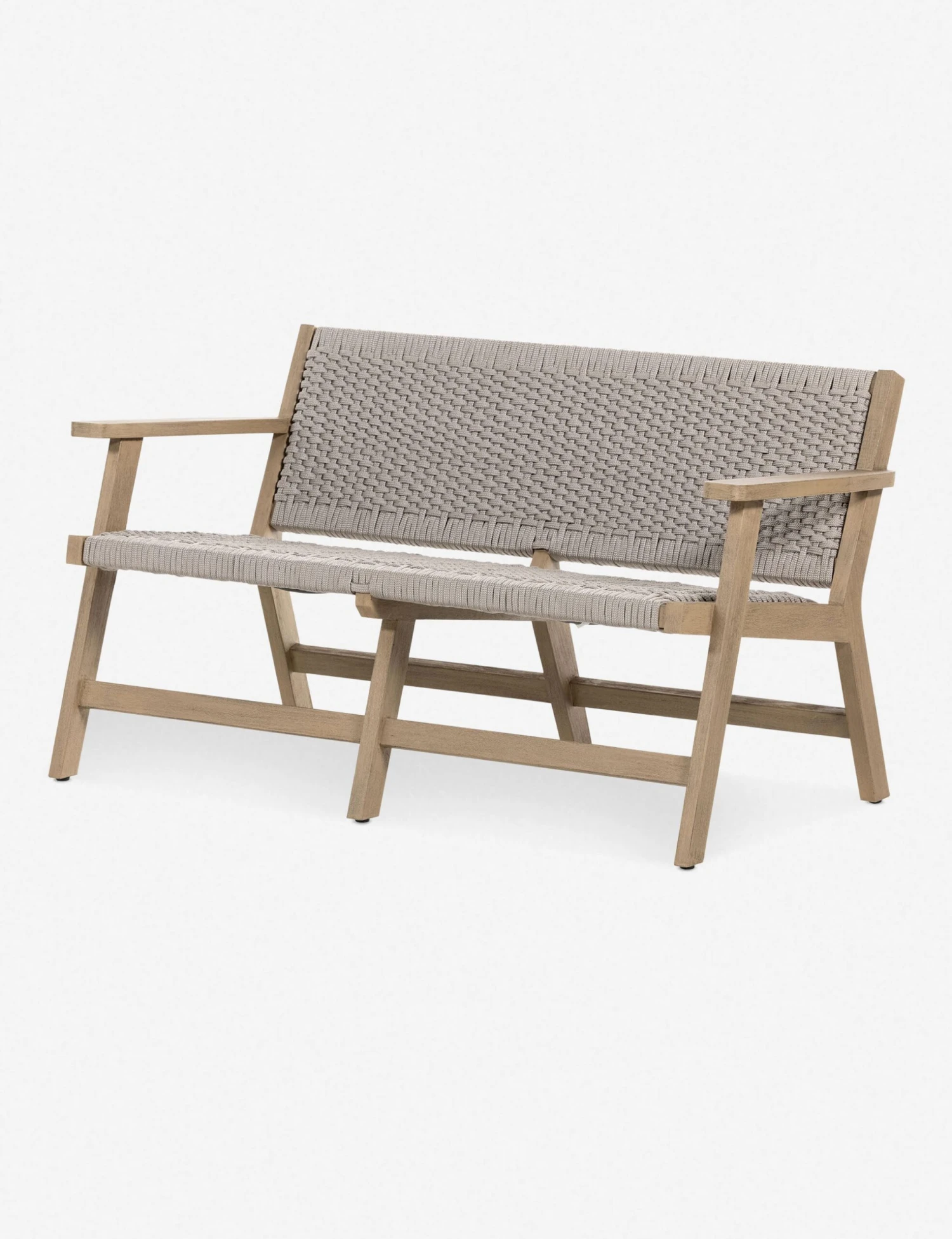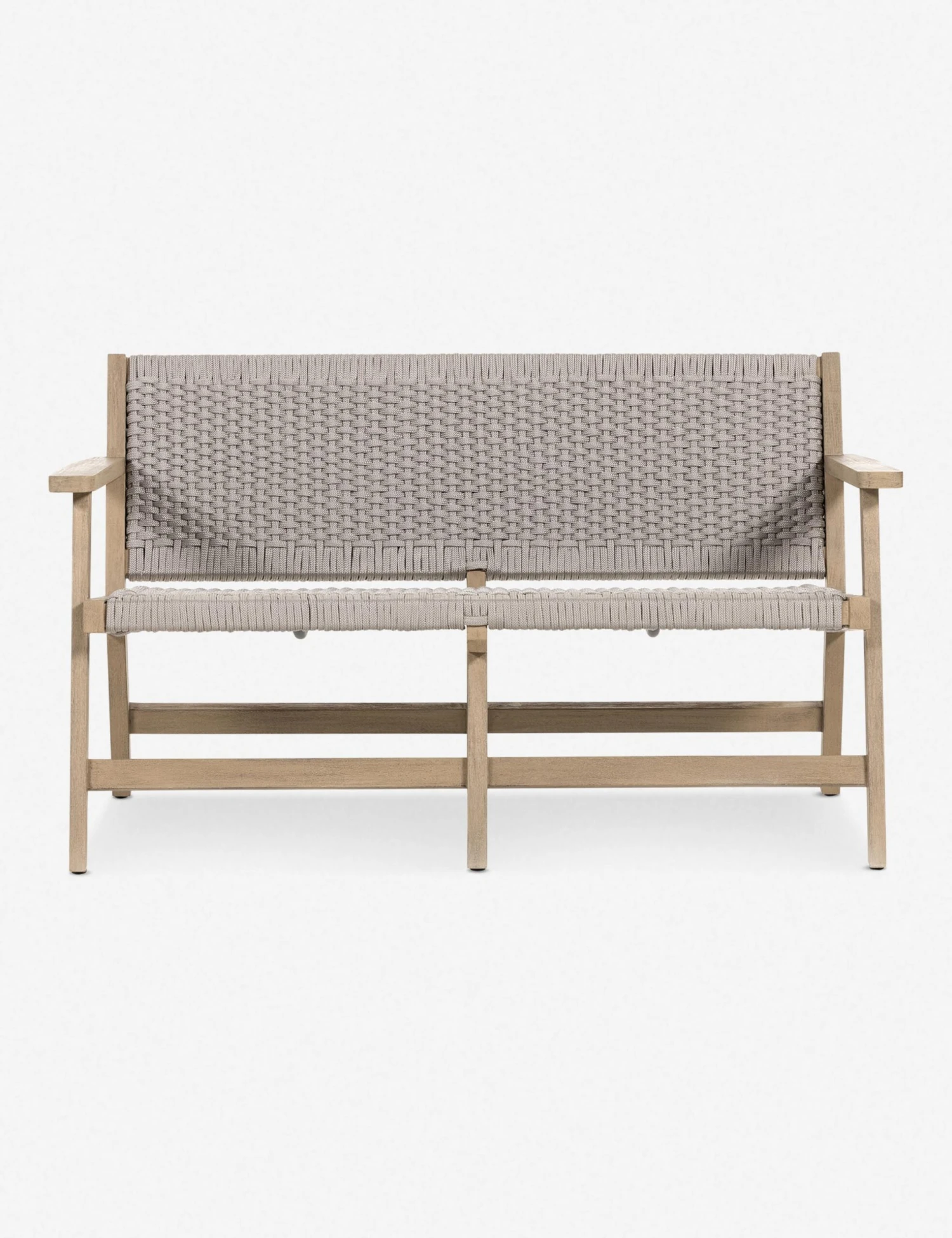 A handwoven rope seat offers easy comfort with textural appeal in this outdoor sofa. The teak frame features clean lines and flat arms for a transitional style. Elevate your look indoors or out with the versatile neutral tones and understated design of this pared-down couch.