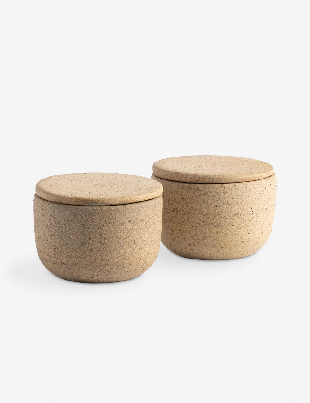 The Diem kitchen collection is crafted in the Talavera ceramic style to offer a beautiful earthenware dish set with a simple grounding tone. These small jars each feature a matching lid and are ideal for quick pinches of salt, table sugar, or bespoke spice blends.