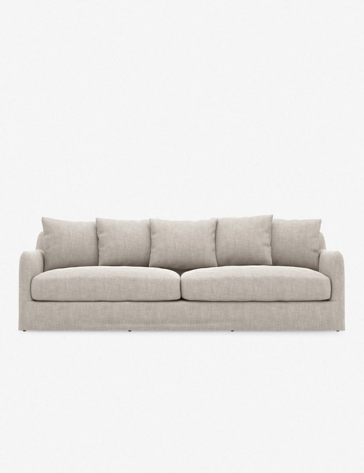 A billowy slipcover sofa stacked deep with pillow cushions for effortless comfort. The slipcover and cushions are made with performance fabric to offer an outdoor-friendly style making this easy-care couch perfect for a transitional space or even an extra plush outdoor lounge.