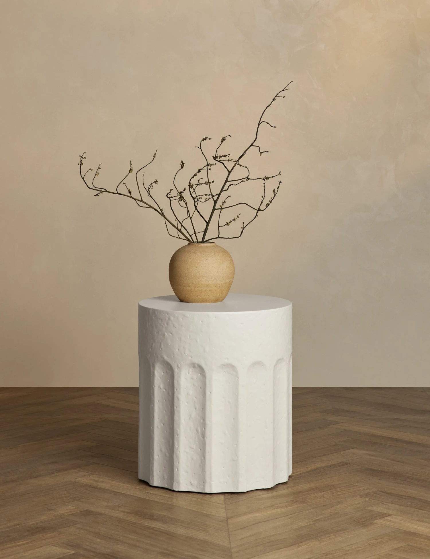 Classical design notes get a modern treatment with this round fiberstone side table. The textural column-style base supports a polished top, creating a refined end table design that can elevate an indoor or outdoor lounge with timeless poise. This piece is from our exclusive Sarah Sherman Samuel collaboration and features all the trademarks of her warm, edited style.