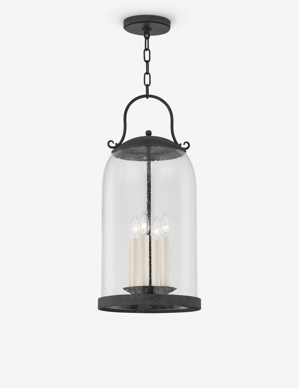 A black metal housing around seeded glass inspires a timeless appeal in this lantern-style hanging light fixture. This pendant can mount in a covered entryway or porch to offer antique charm with modern appeal.