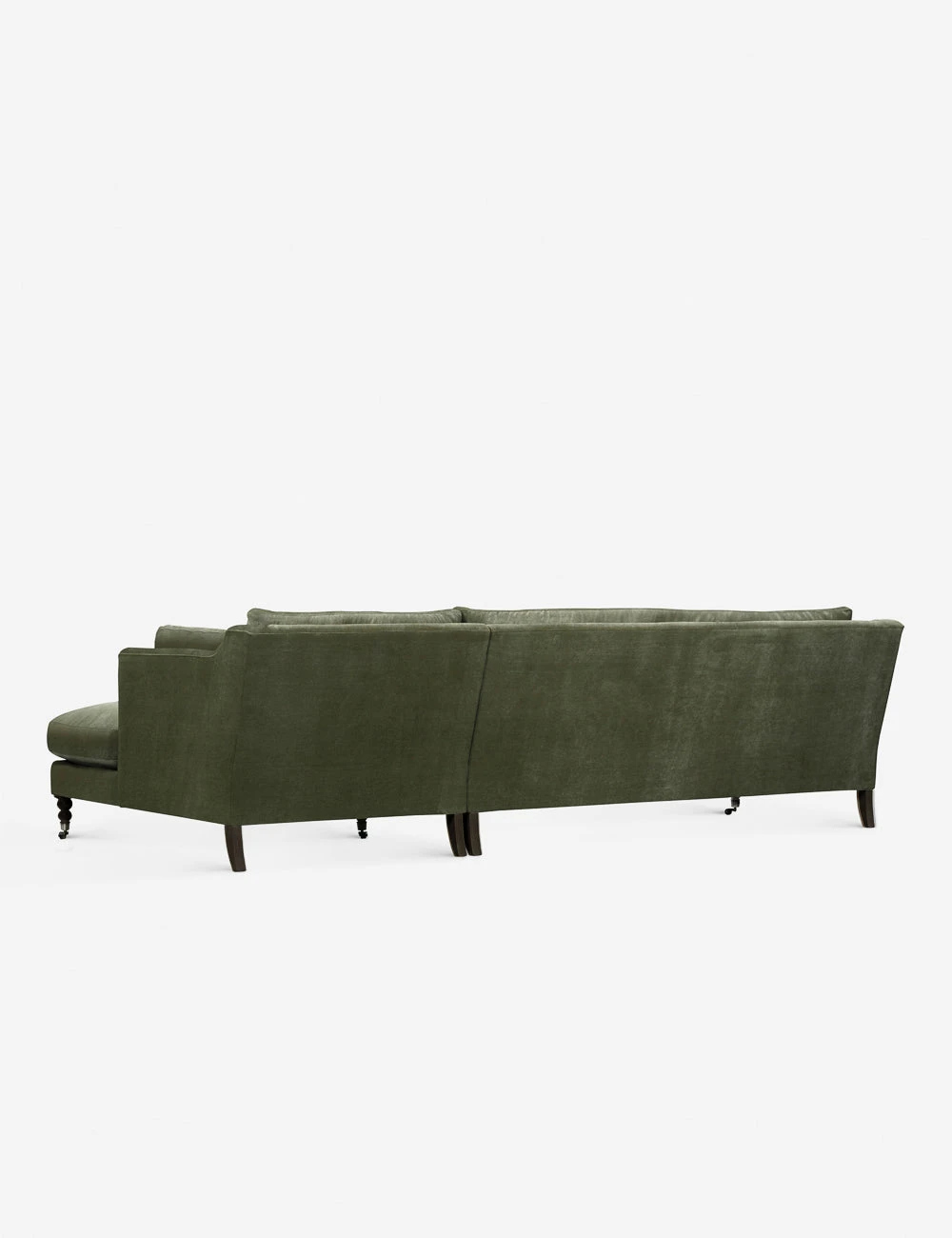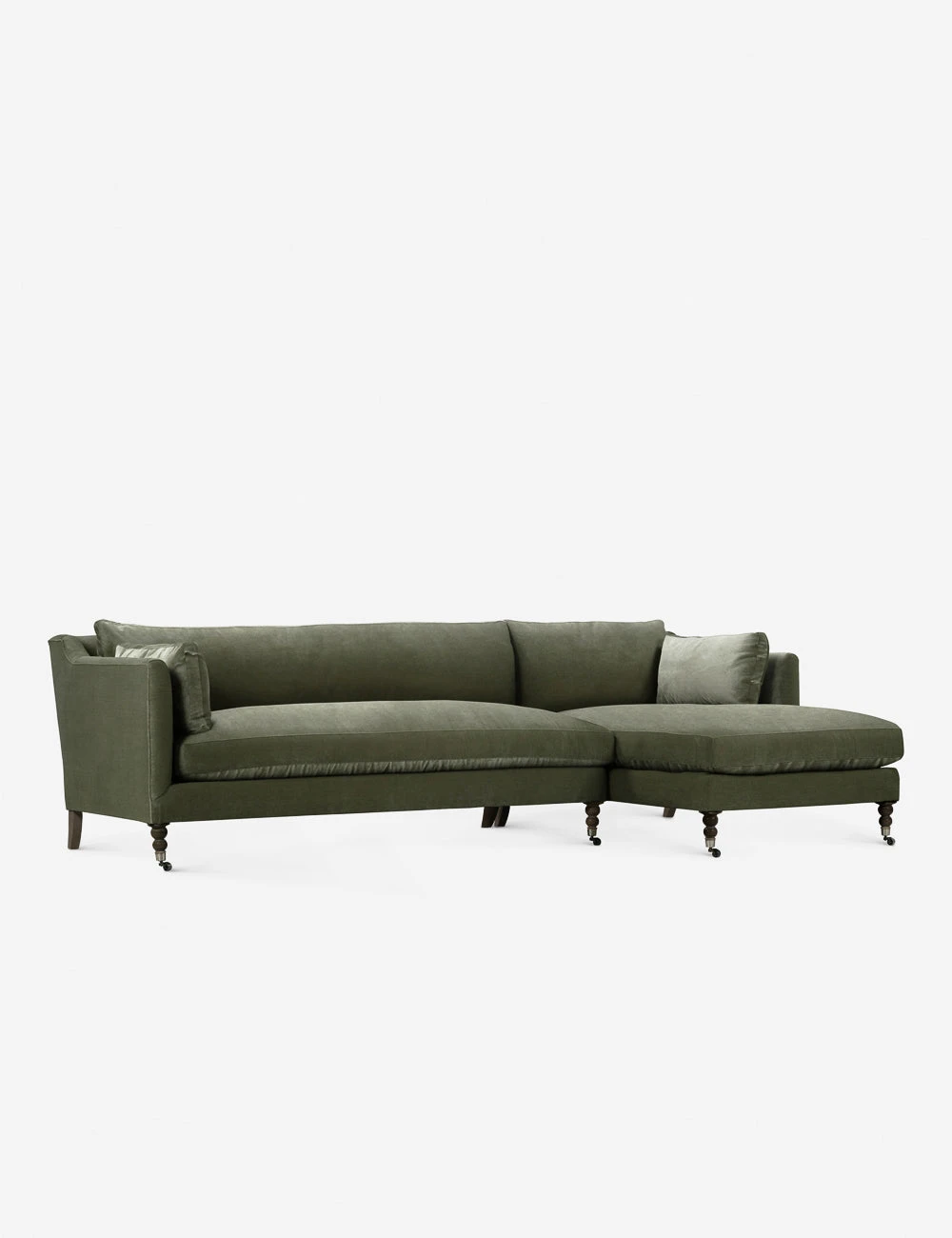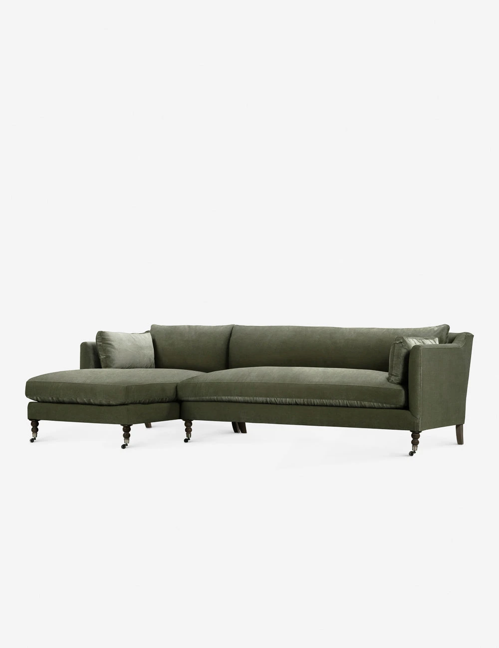 Add a touch of vintage flair to your living room or office with the Fabienne Sectional Sofa. Antique styling pairs velvet upholstery with traditional curved legs in the back and ornate, turned legs in the front. This sectional with a chaise is finished with small front wheels to ease movement.