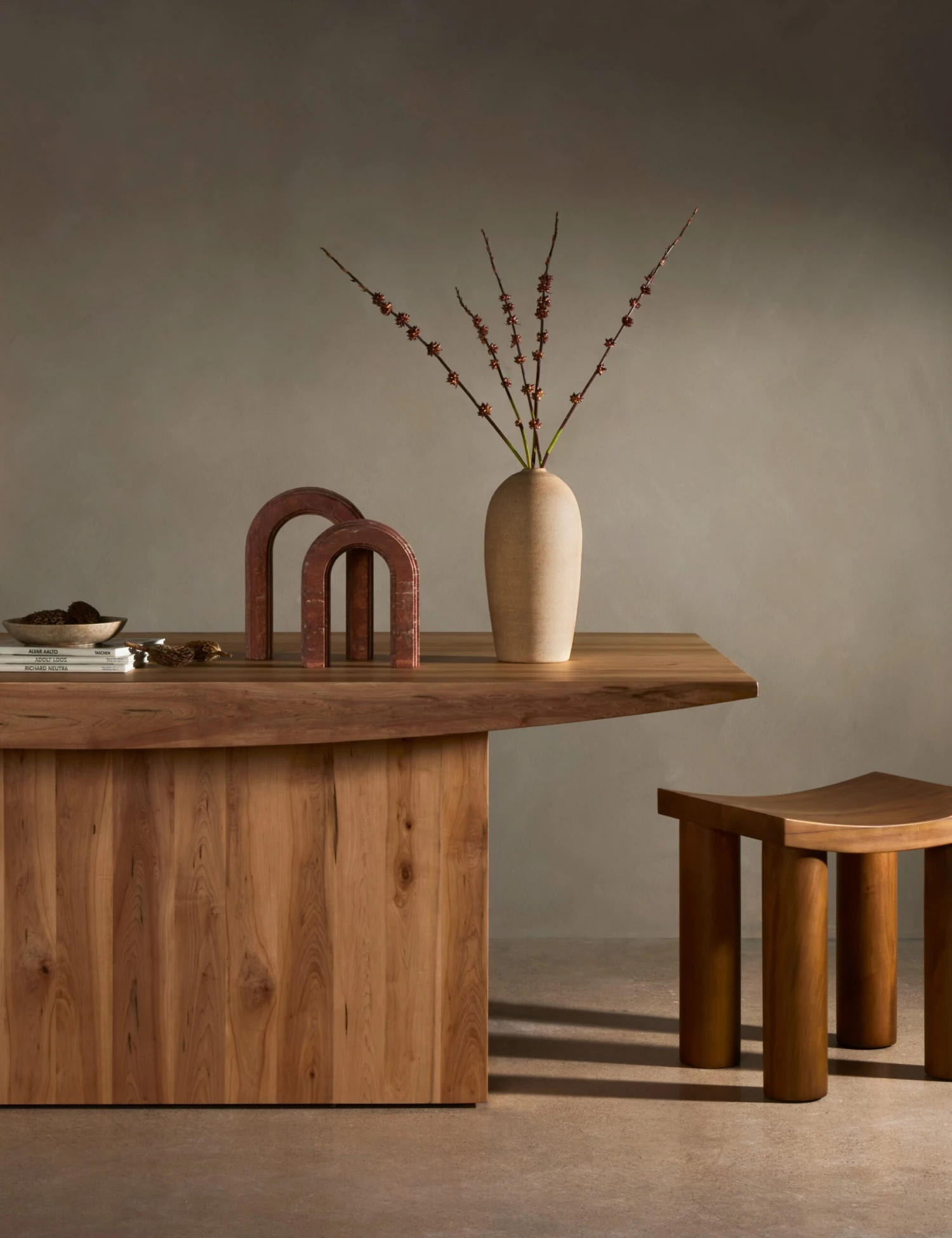 The Hamer collection is all about bringing showstopping design to everyday spaces. This table features a curvilinear top set on a pedestal base to offer a stately silhouette with room for eight. A light finish highlights the natural warmth of this maple-clad dining table.
