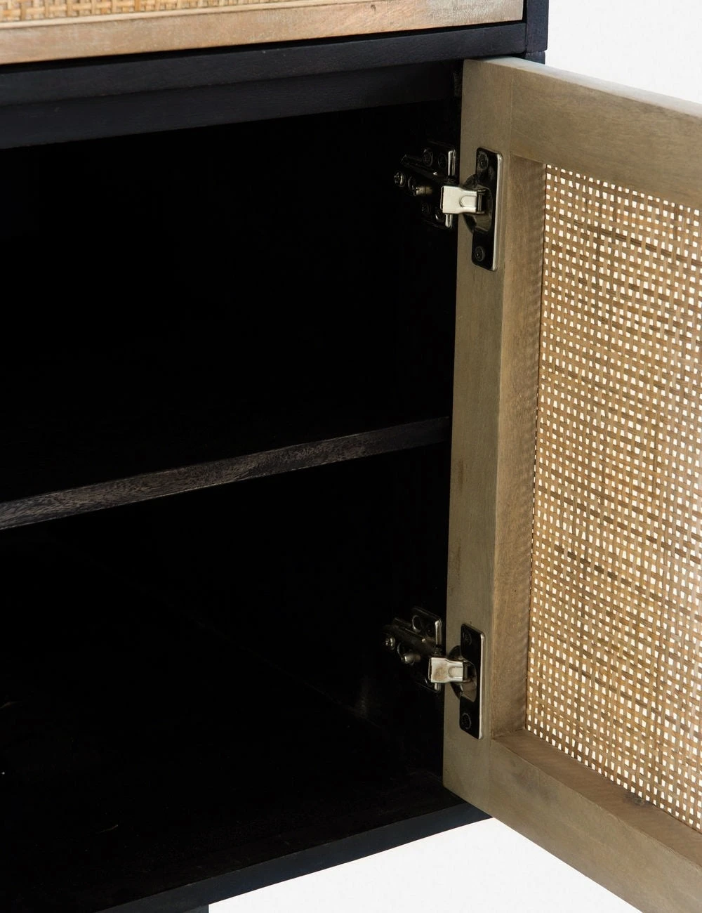 A stylish option for your home office, this wood desk features natural-tone woven drawer fronts for added texture. Black metal legs and peg drawer pulls finish the look for a modern touch