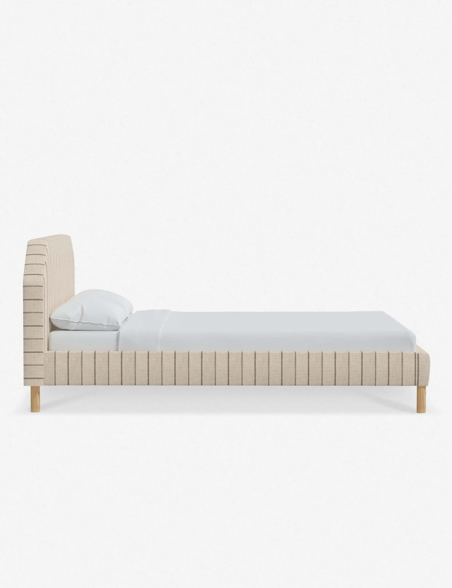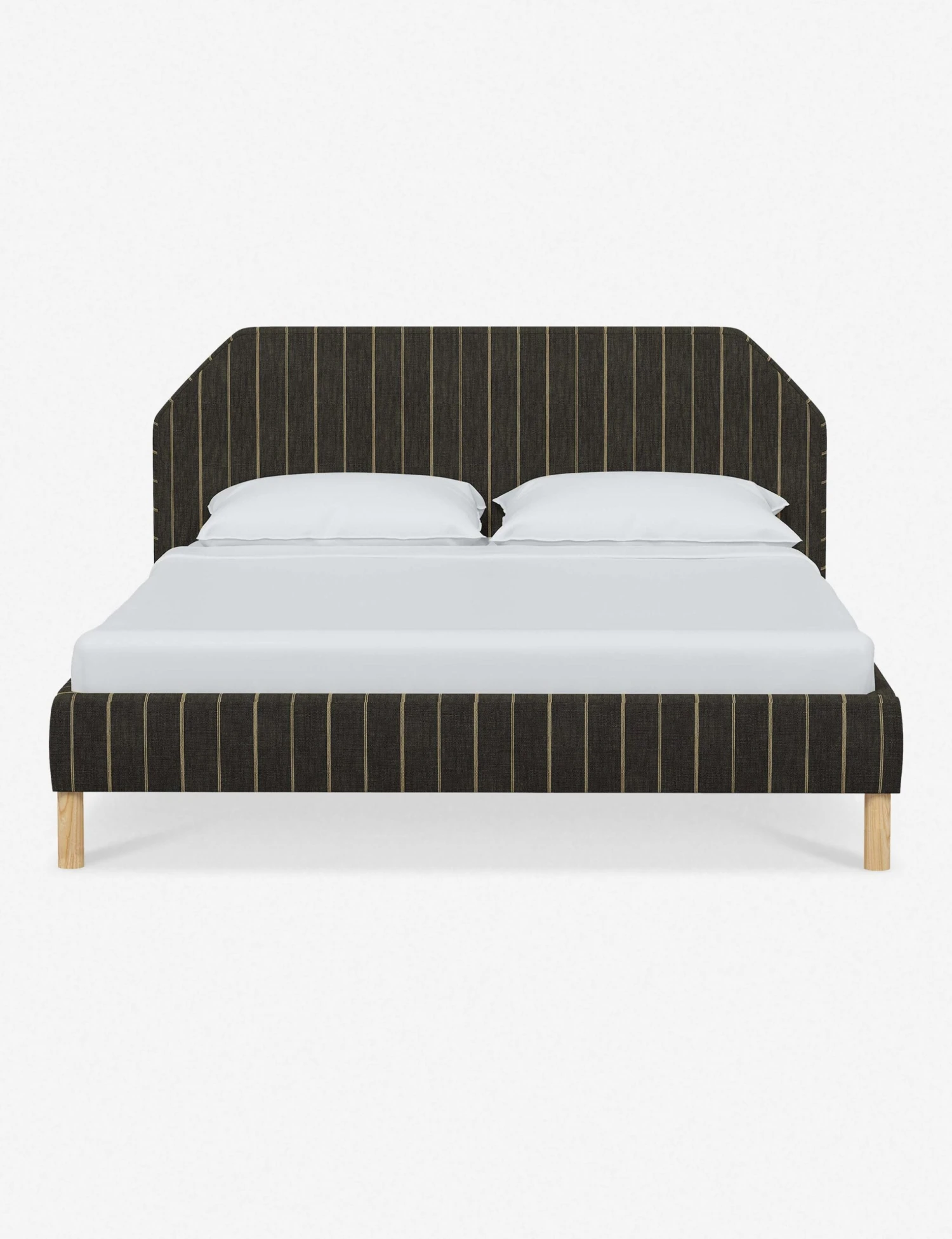 Geometric lines set off a streamlined, modern silhouette in this exclusive bed frame with headboard design tailored for versatile styling potential. This platform bed is raised from the ground with bare, pinewood legs and trimly upholstered from footboard to headboard to offer your space a fresh focal point that will transform your look.