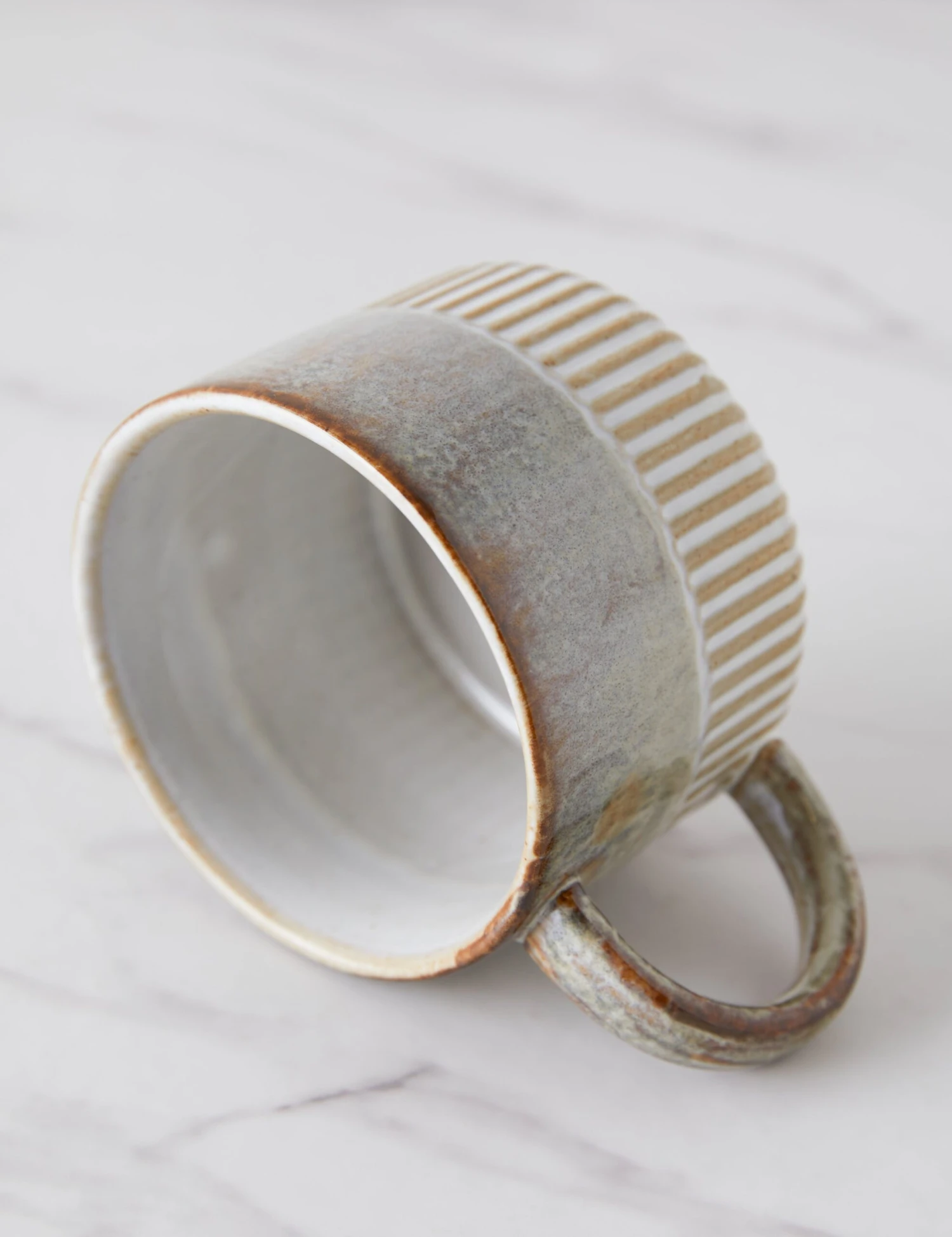 Bring a chic striped design to your everyday sipping rituals with this oversized stoneware mug. Crimped accents offer a rich texture that stimulates the earthy tones of this low cup’s balanced design.