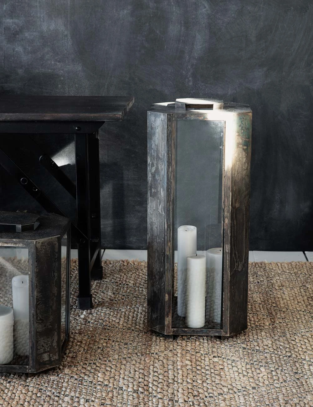 Layer a rustic tone into your look with this tall lantern. The raw iron and glass panel housing has a beautiful patina to it and inspires an industrial charm you can style from your entryway to a quiet garden terrace.