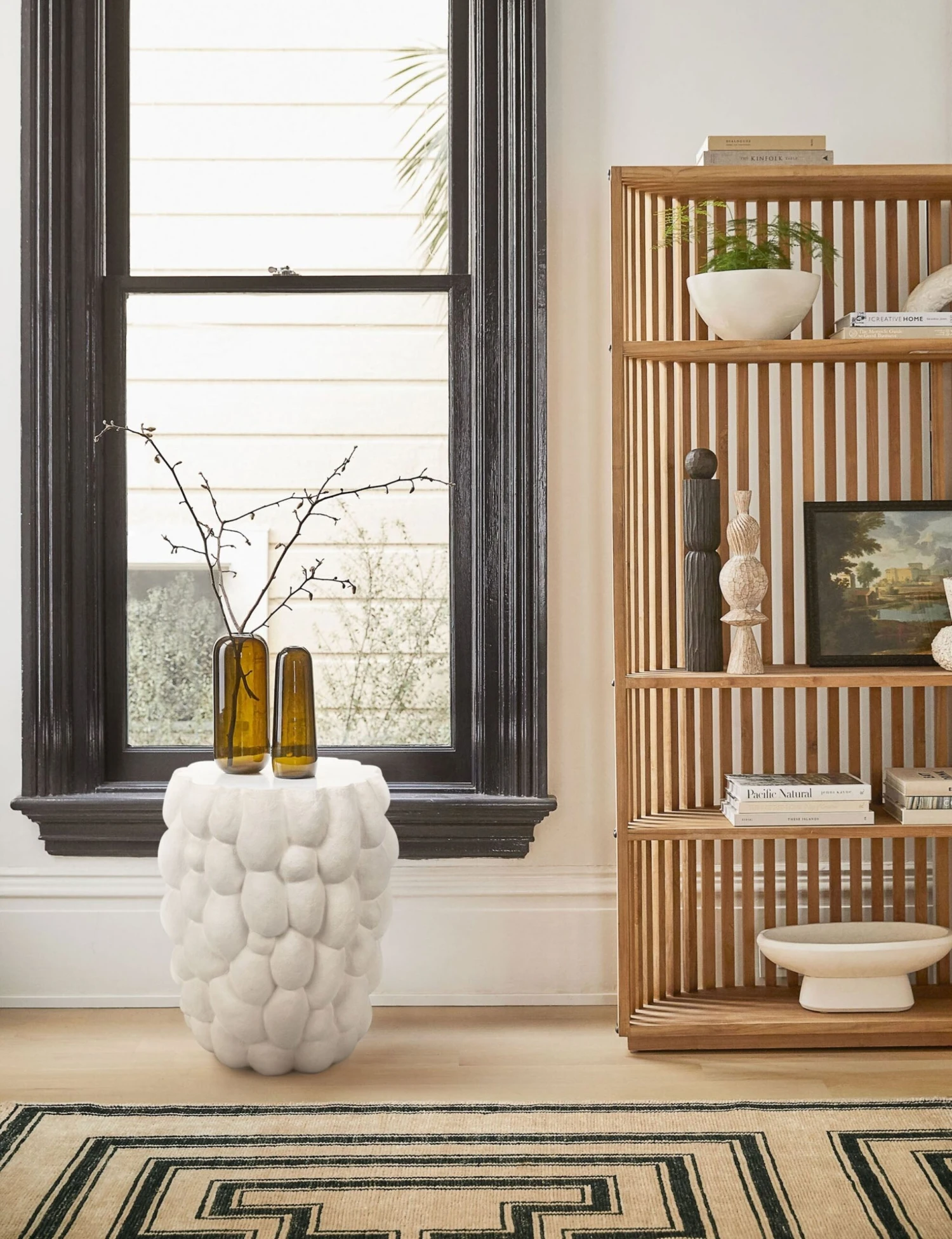This eccentric side table is skillfully sculpted from fiber cement—a durable material known for its rich, organic quality—and is finished in a perfectly minimal neutral shade of white. The accent table leads a double life as a functional side table and as an art piece that easily stands on its own. Either way, it integrates well into any space.