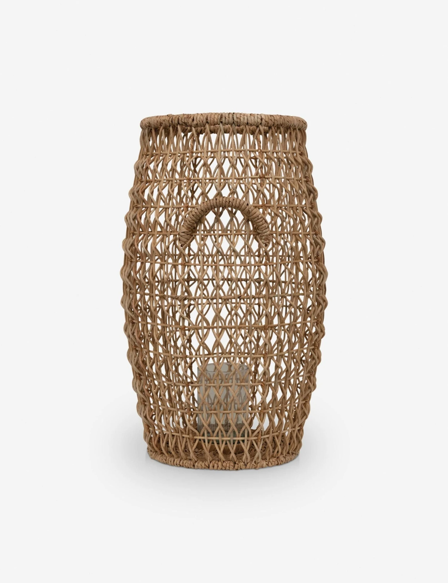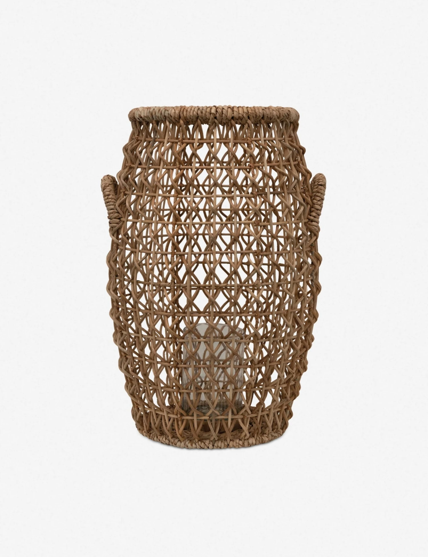 Create a dreamy atmosphere with this lantern, enjoying the candlelight as it flickers through the intricately handwoven weave. Crafted from natural fibers and featuring a glass insert and handles, this light looks right at home atop a mantel, console or sideboard.