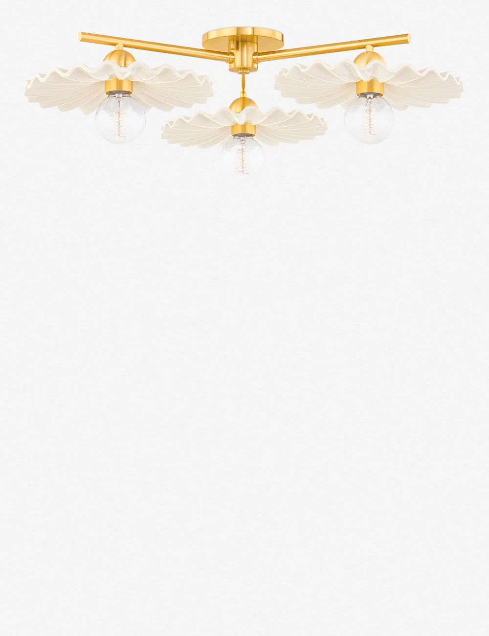 Refresh your lighting design with the delicate yet dynamic silhouette of the Madrona semi-flush mount light. The ruffled form of the shade catches the light, offering sculptural contrast against the clean lines and polished luster of the antique brass finished fixture. This damp-rated overhead fixture is a great way to create stunning impact in a bedroom, bathroom, or small-space lounge.