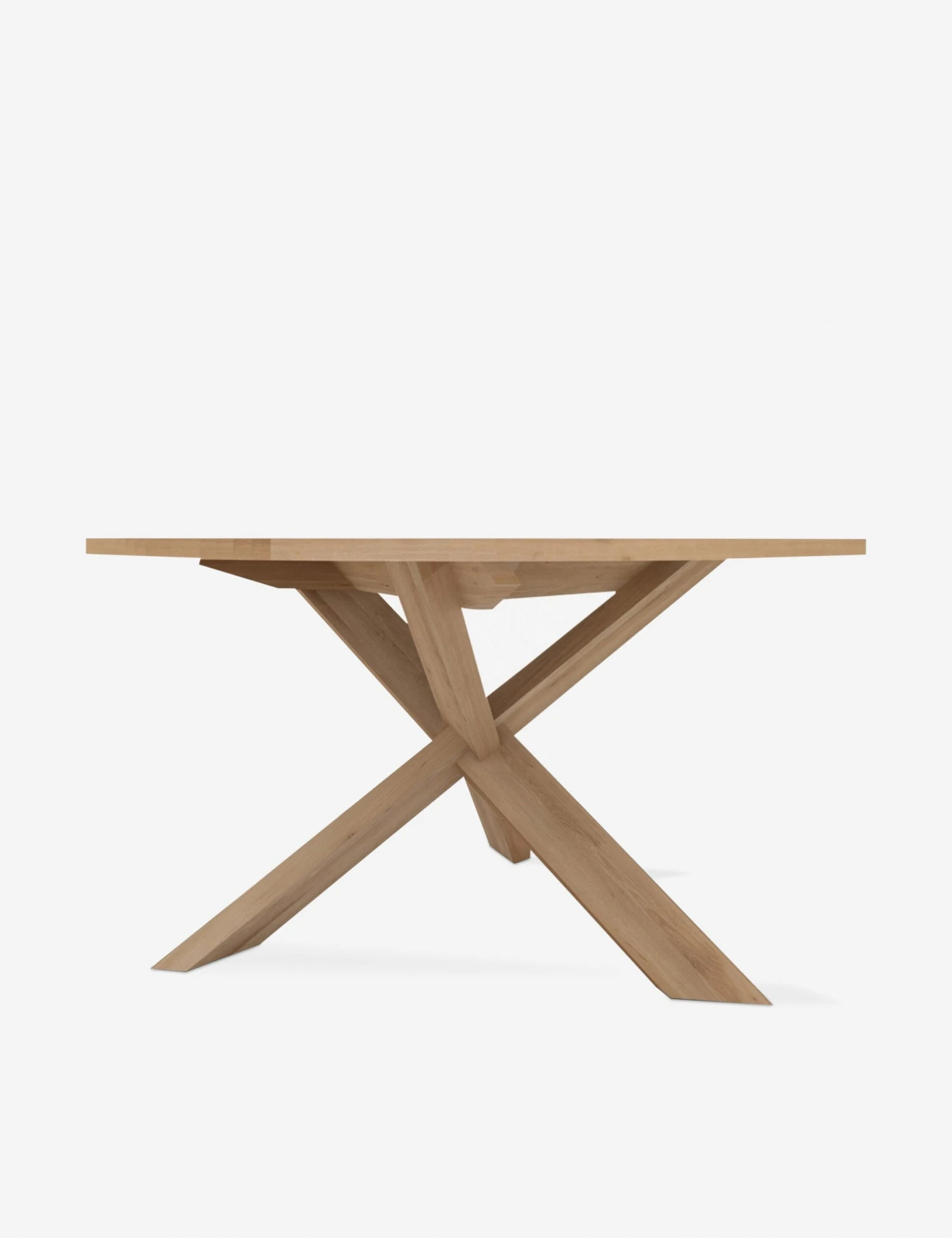 It’s an optical illusion! This modern oak dining table is the ultimate sleek statement with angular, intersecting legs and a round top.