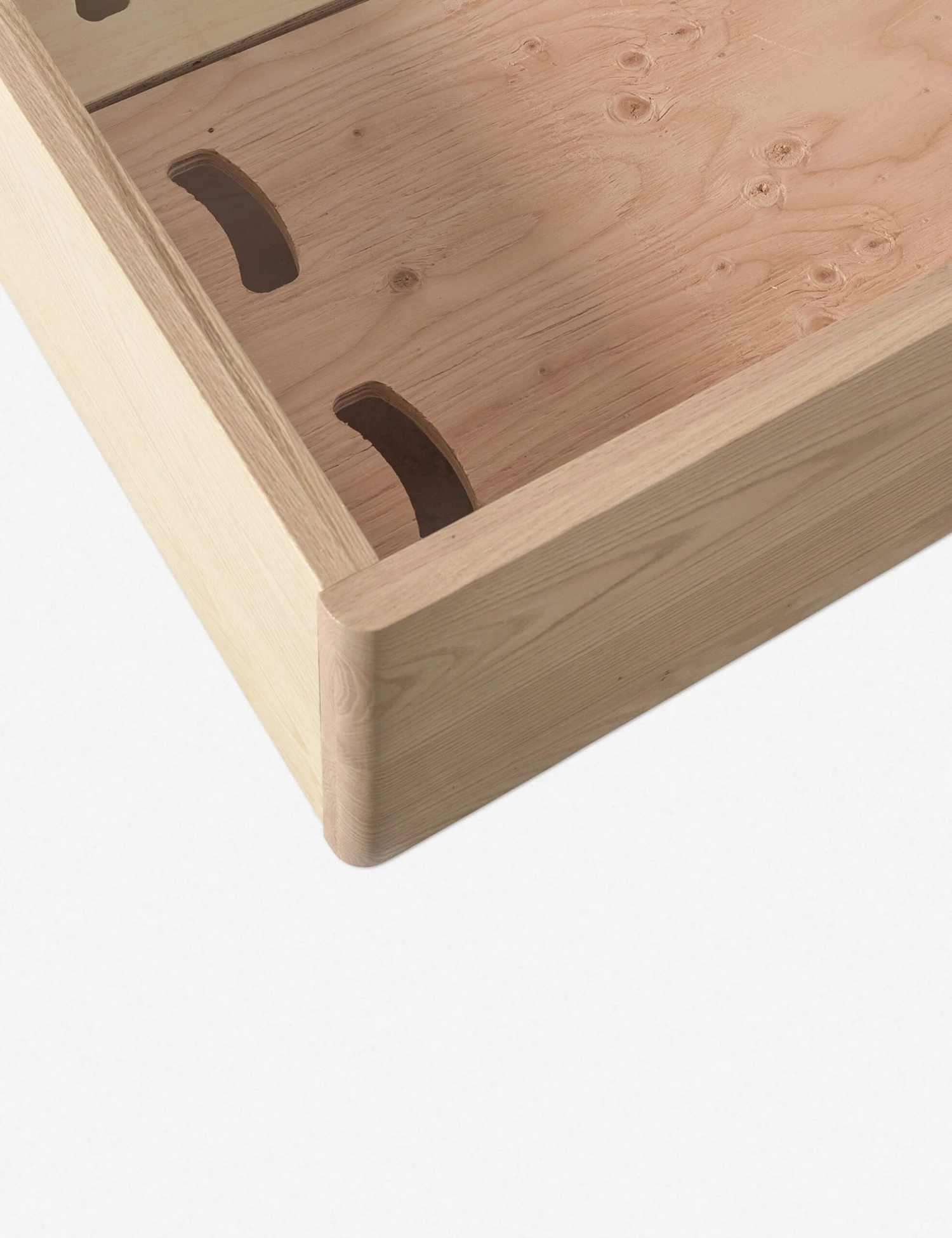 A dream come true for contemporary and transitional bedrooms, the Nia Bed comes in a simple platform design, wrapped in a neutral wood that instantly warms up your space. We love how the rounded corners and linen upholstered headboard soften the look for a stunning finish!