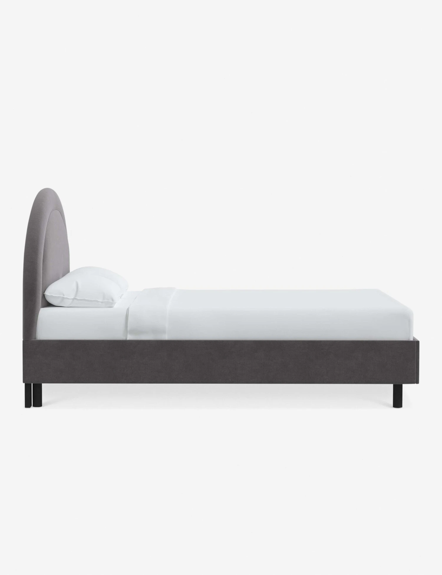 Offering an inviting focal point for your bedroom, this soft design blends sleek lines with a tranquil shape. The arched headboard is upholstered with a welted border to augment its plush profile. In a variety of colors and fabrics, this bed frame with headboard can be tailored to your look.