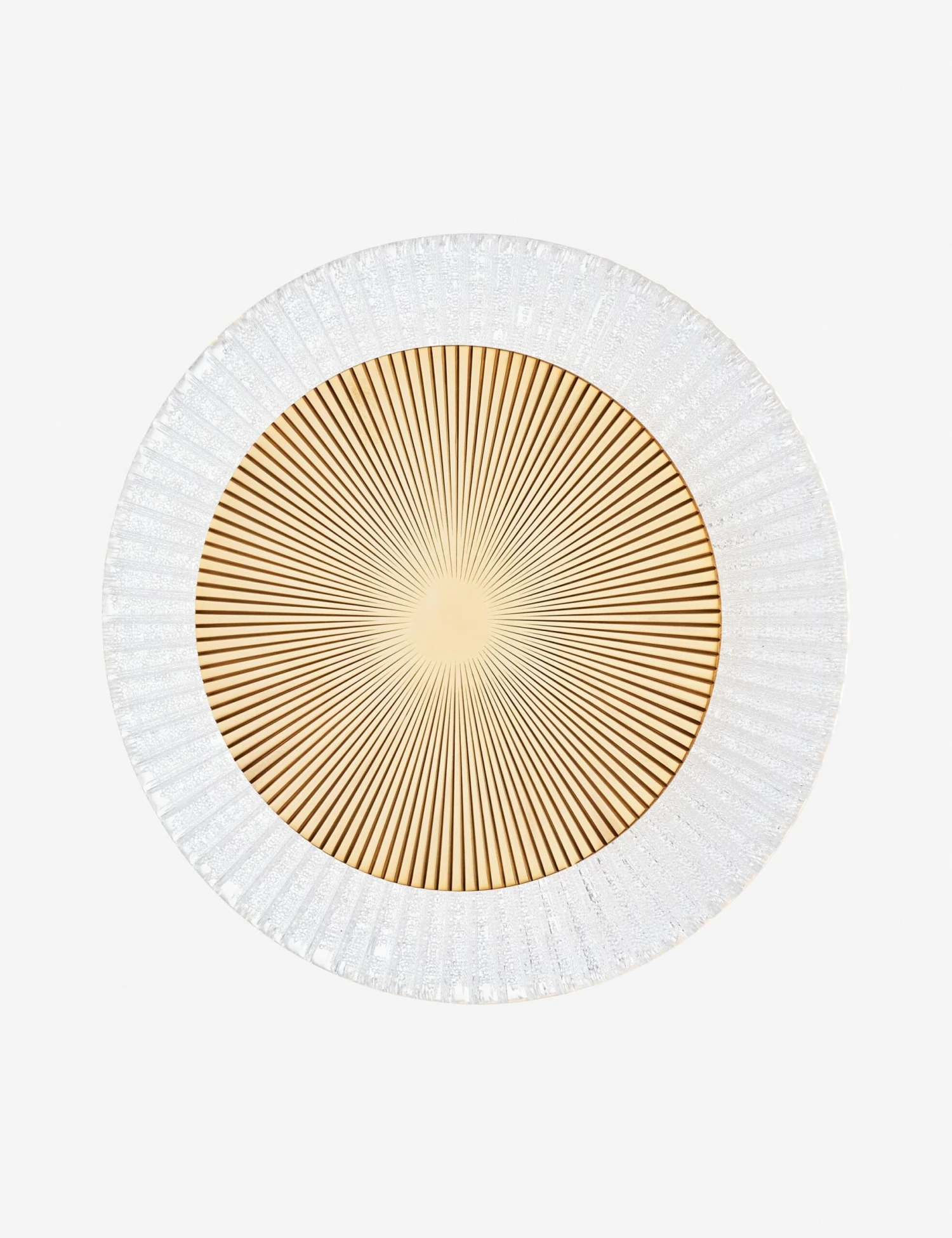 The Pellard sconce brings brilliance to lighting. The circular design features a rippled metal disk set against piastra ice glass in a visually stunning display. We love this sconce light for its warm sophistication, whether styled alone or in multiples.