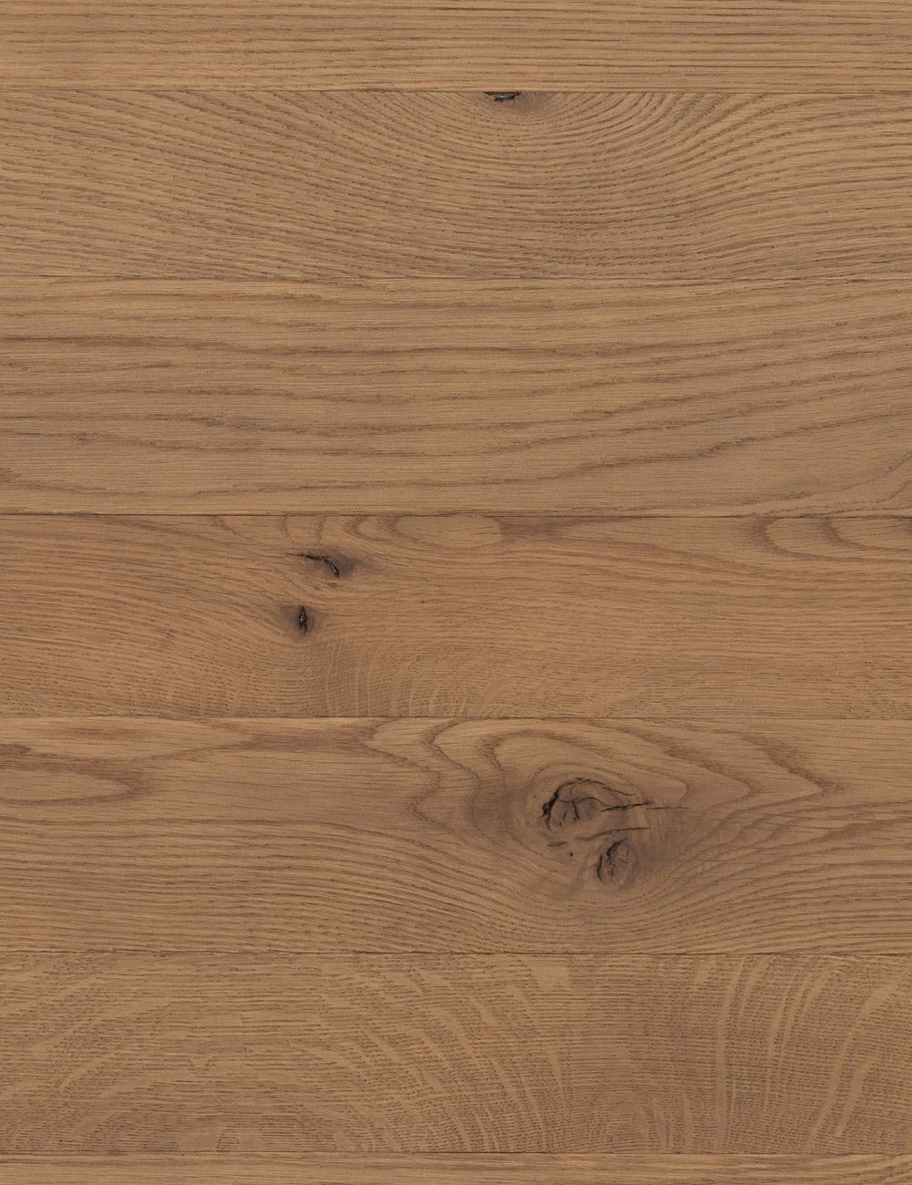 Casting a clean, cut silhouette, this coffee table design is softened by a curved-bottom tabletop sturdily set on two flat, solid legs. Clad in a beautiful oak veneer for natural grain appeal, we love the warm and refined tone this wood coffee table offers to the center of a room.