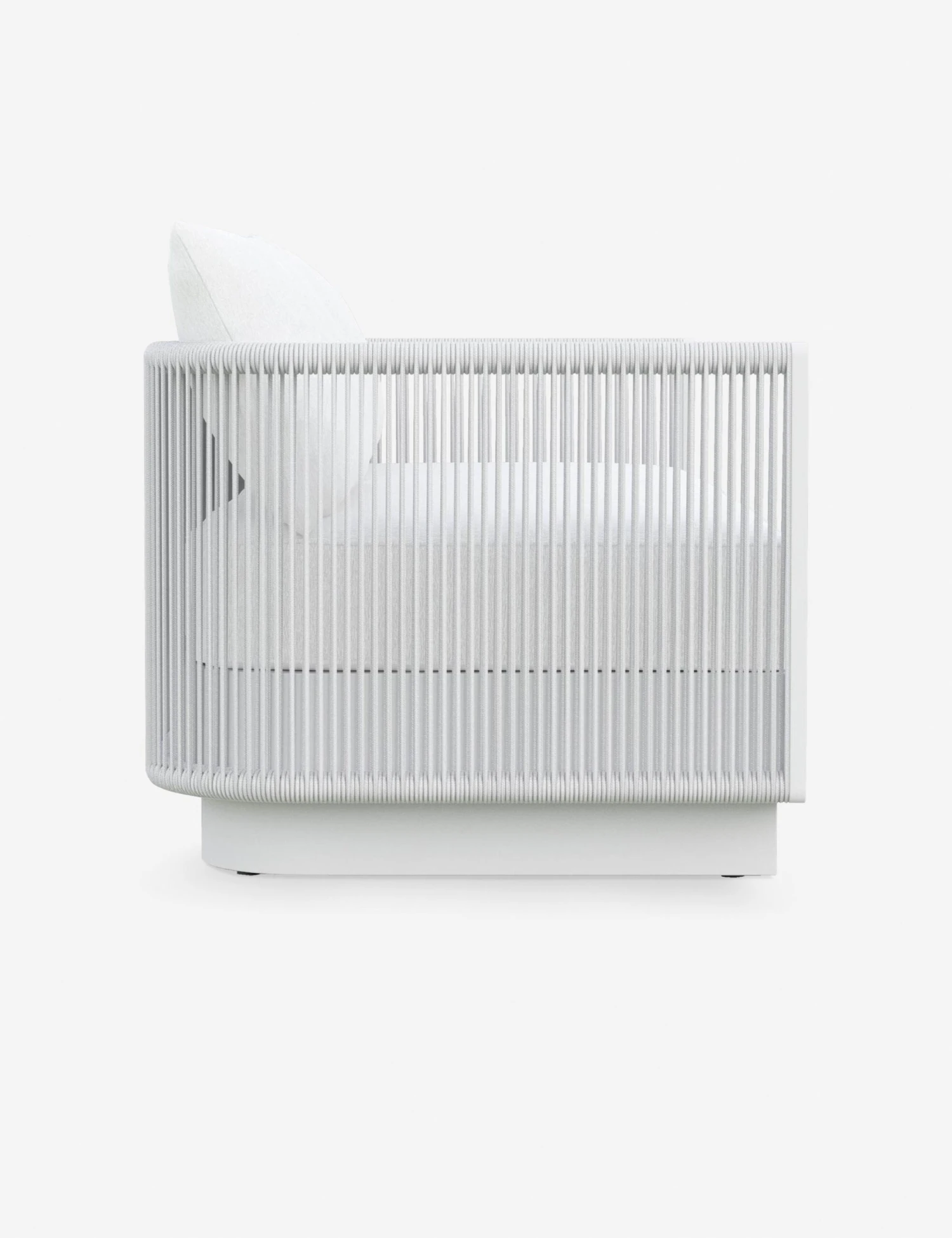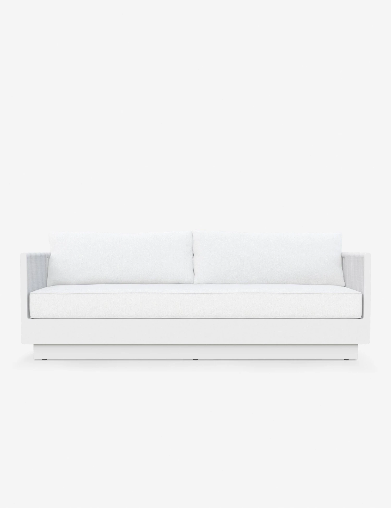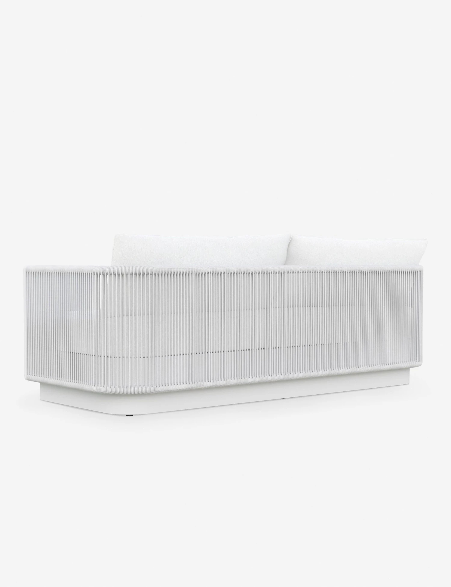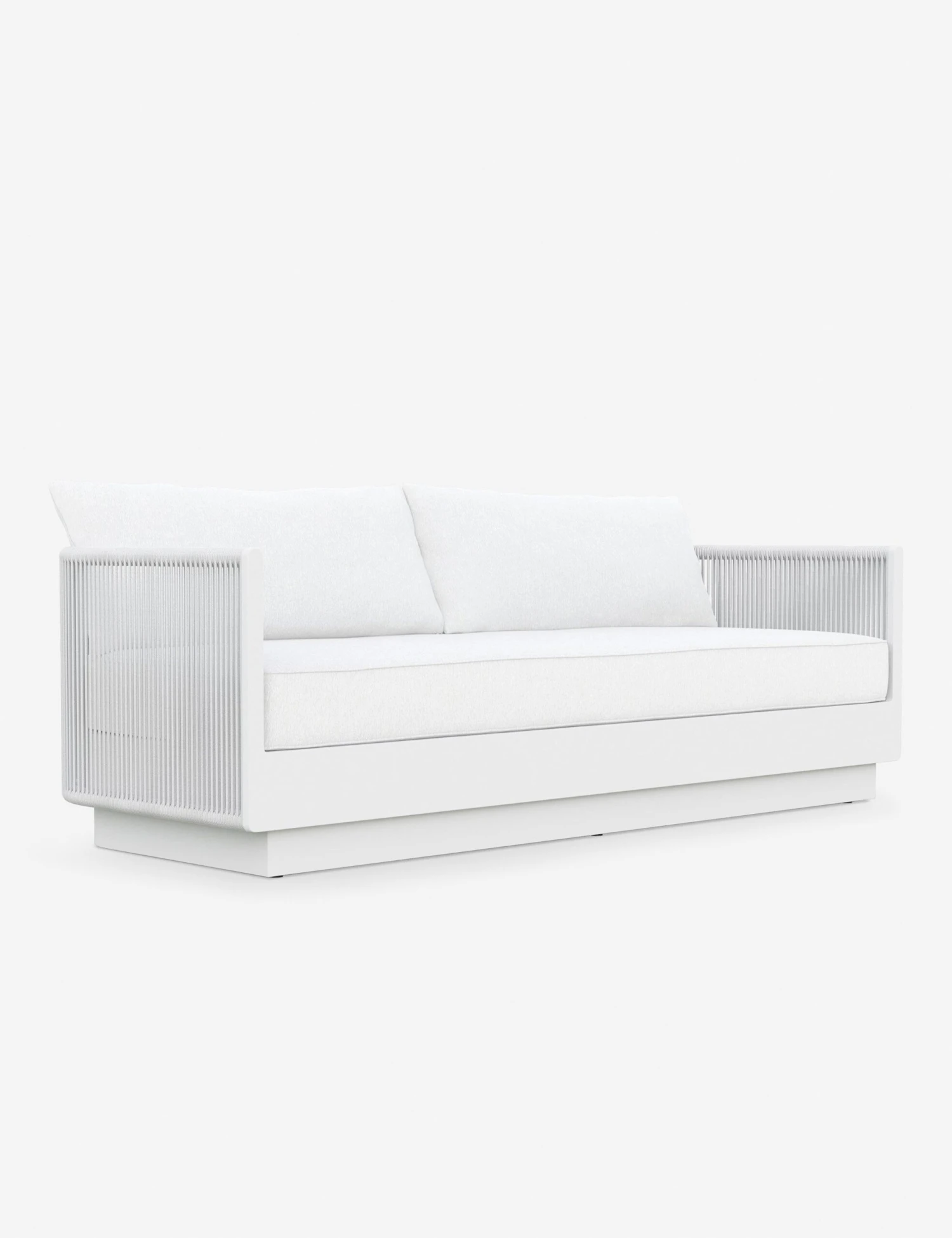 The Romero sofa cuts a clean, modern silhouette in white. The aluminum frame features all-weather rope accents adding texture and accentuating the blend of precise angles and rounded lines. With its performance cushions, this sofa is set for effortless elegance in a refined patio or sunroom edit.