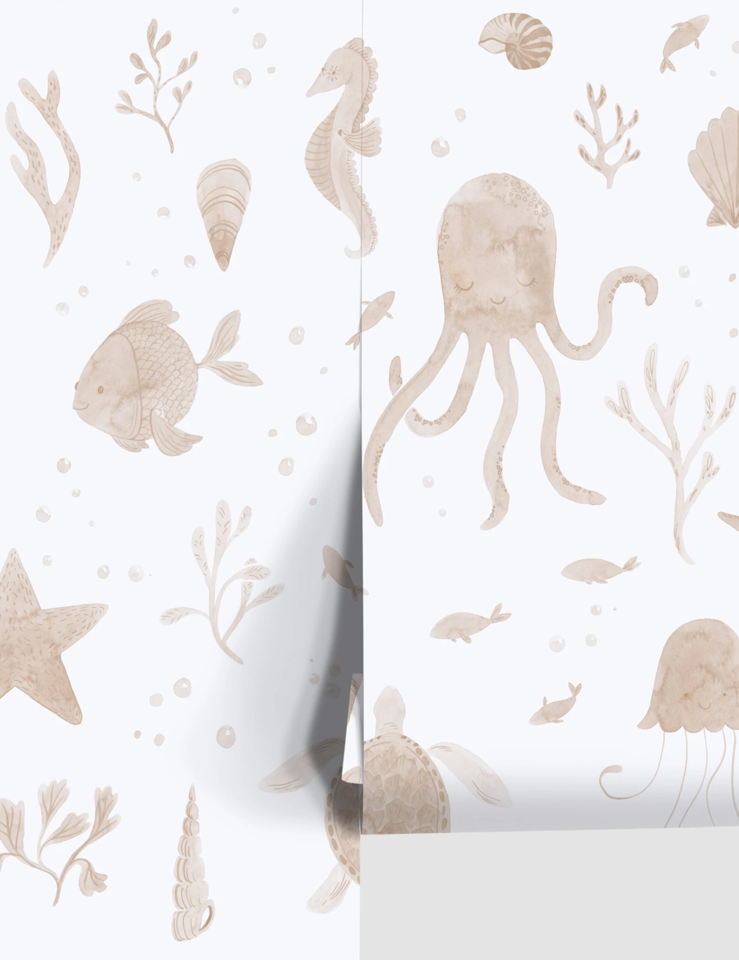 Add underwater whimsy to a kid’s room or nursery with this marine life wallpaper. An adorable collection of sea creatures and shells pop against the white backdrop, inspiring wonder with a modern wallpaper design.