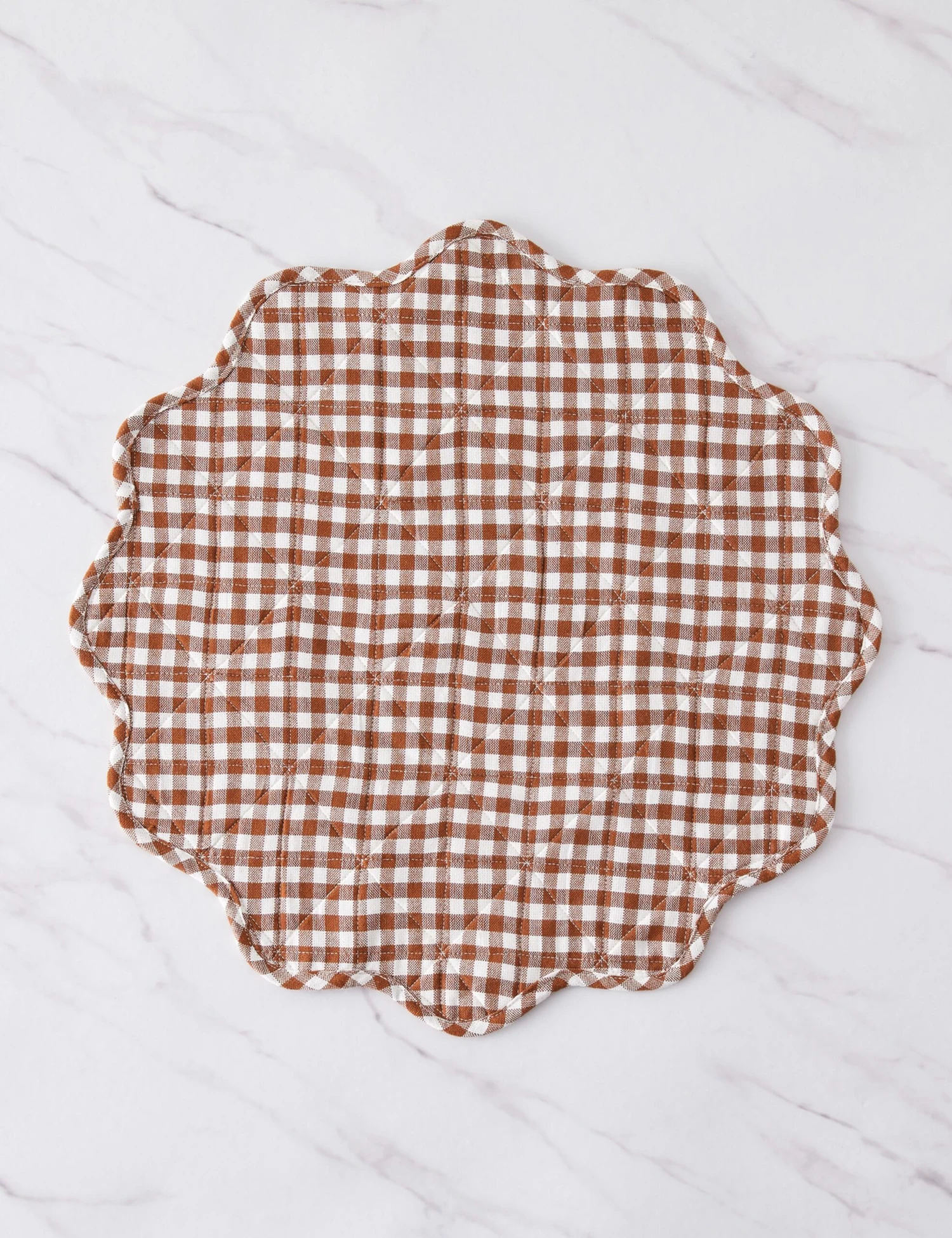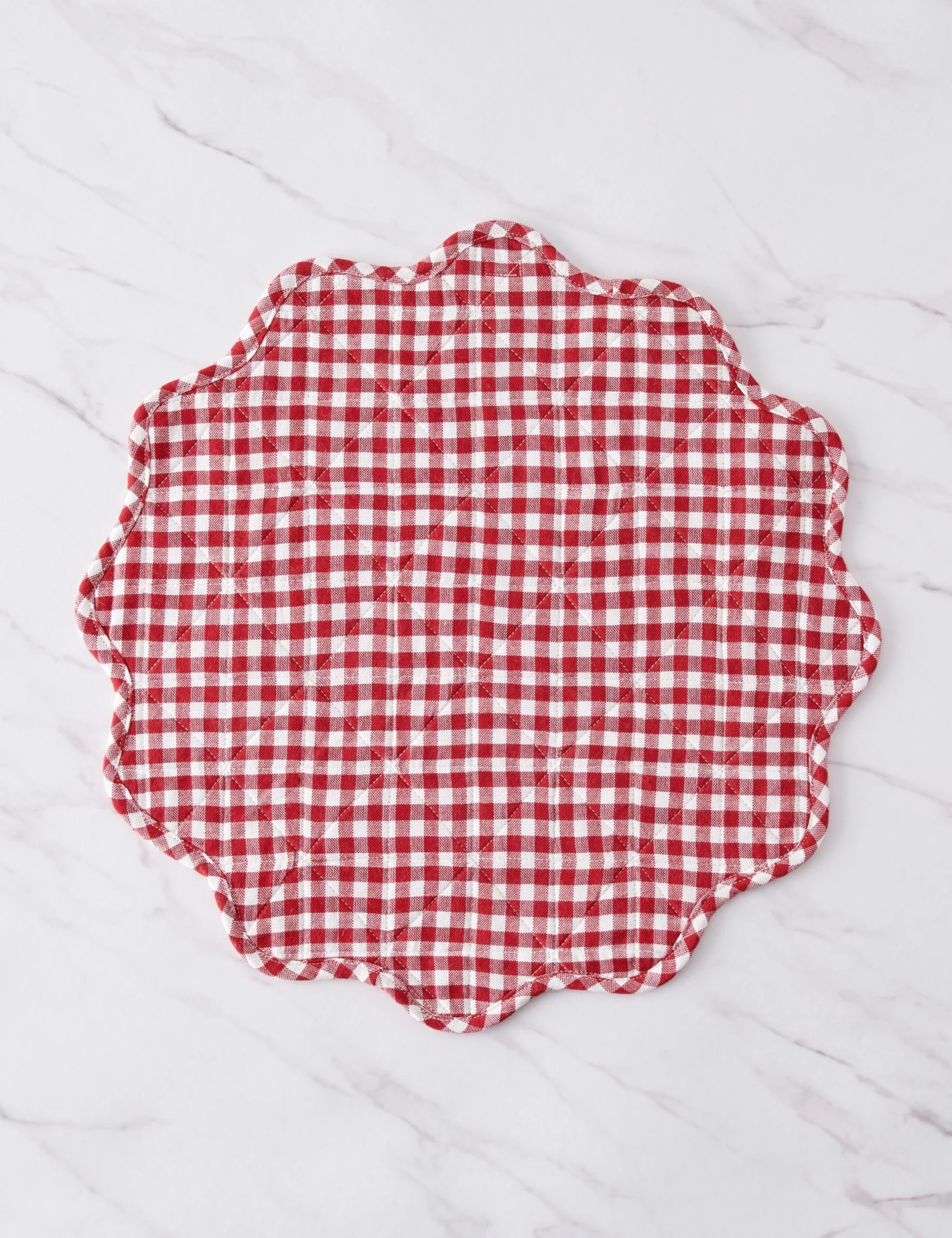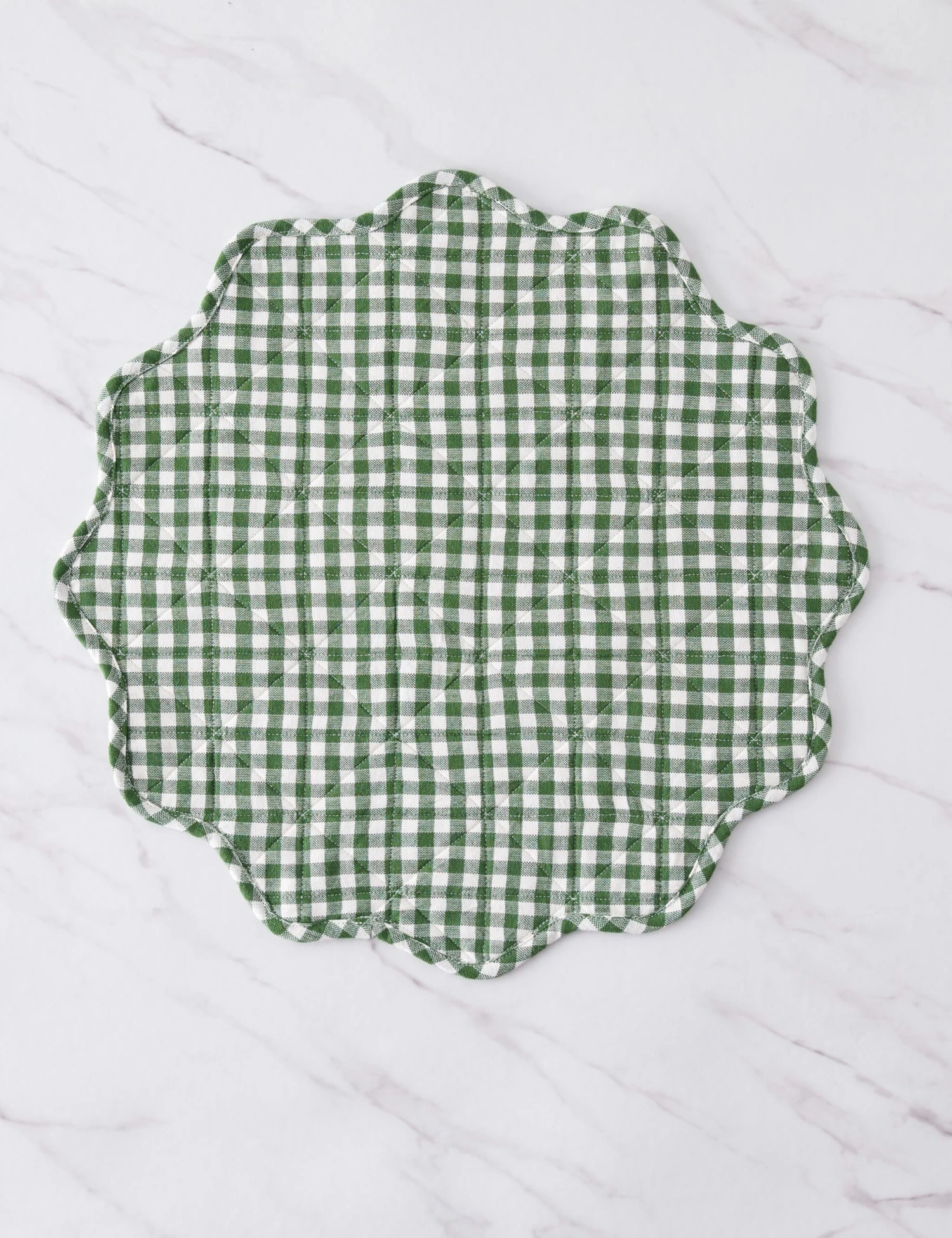 Heather Taylor Home designs linens that fold into and elevate every gathered occasion. Featuring a stylish mini gingham design, this handwoven cotton placemat makes for an eye-catching dinnertable accent with its quilted construction and a scalloped edge.