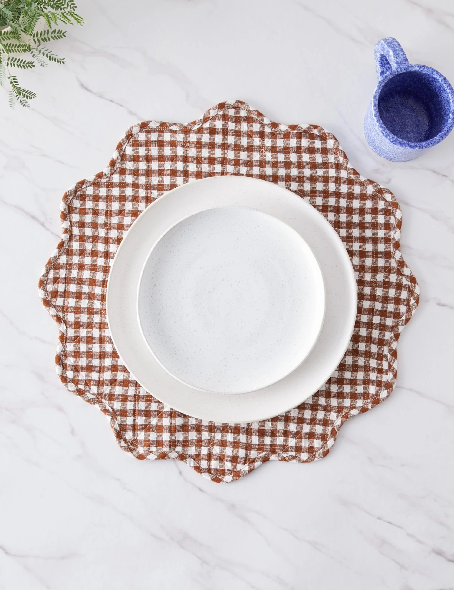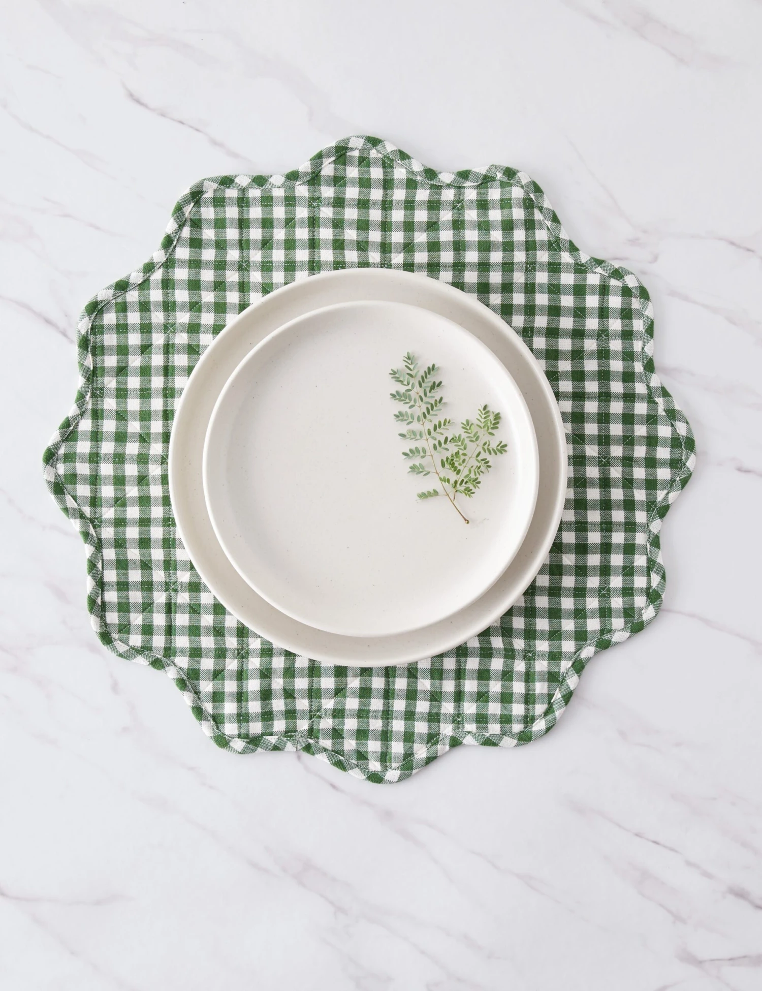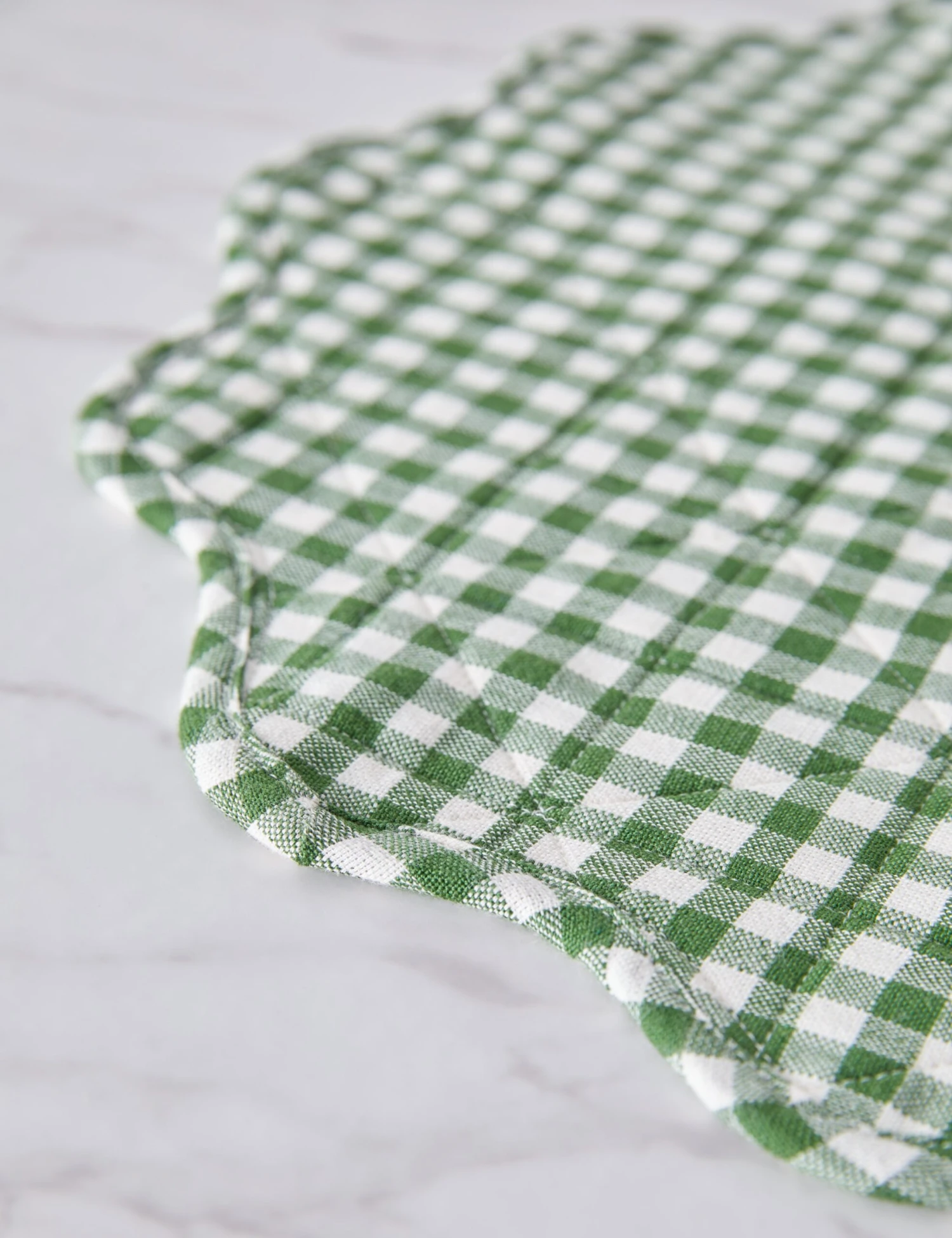 Heather Taylor Home designs linens that fold into and elevate every gathered occasion. Featuring a stylish mini gingham design, this handwoven cotton placemat makes for an eye-catching dinnertable accent with its quilted construction and a scalloped edge.