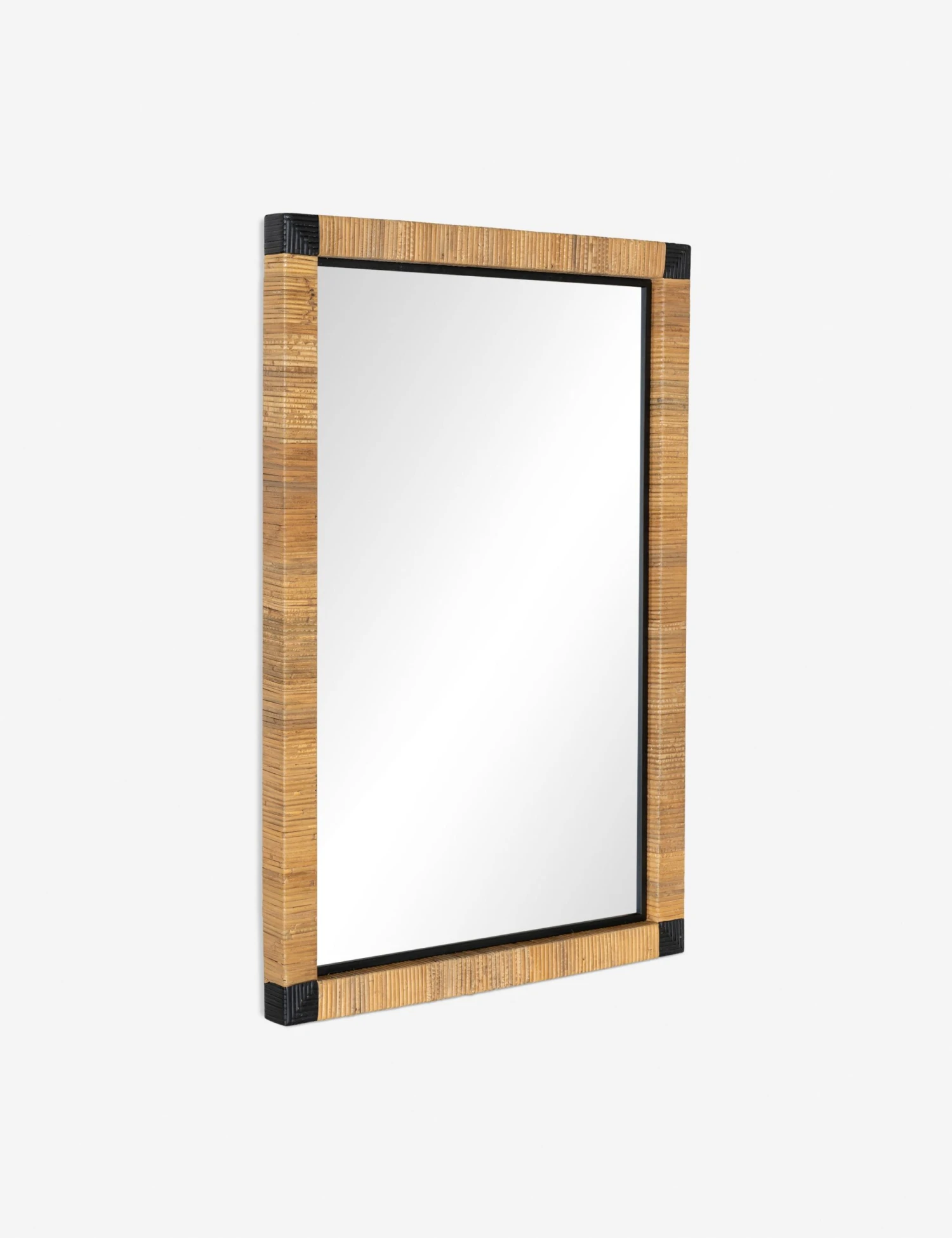An eye-catching design strikes a balance of texture and tone in this decorative wall mirror. The rattan frame offers natural warmth while black corner accents create a touch of contrast. Style this mirror for a casually refined look in your entryway or living space.