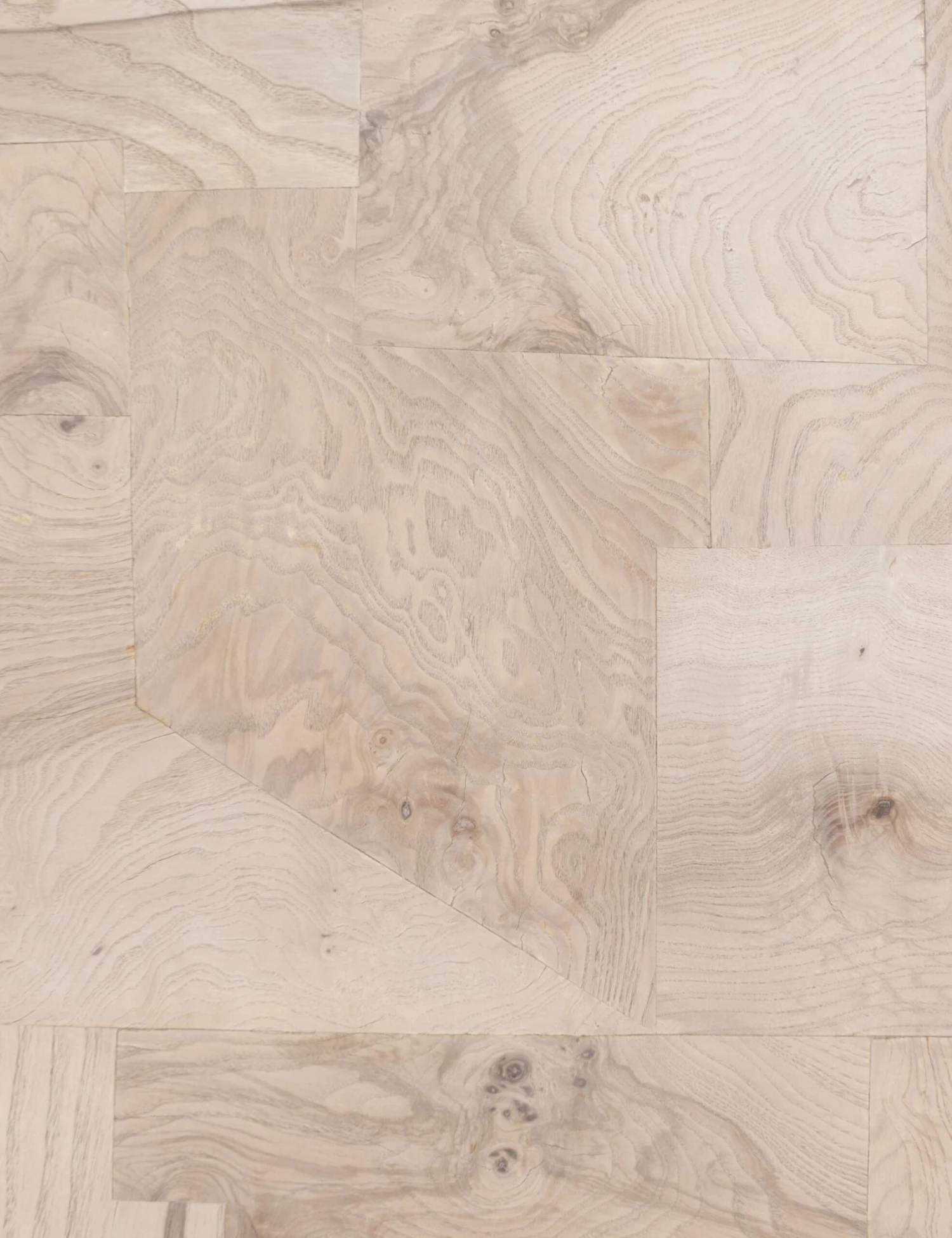 Freshen up the look of your living room with the patchwork tabletop design, rounded corners, and lighter walnut finish of this wood side table. Crafted from bleached ash burl, it features mahogany veneer sides and is finished with a sleek inset base. Pair it with desert hues or tailored neutrals.