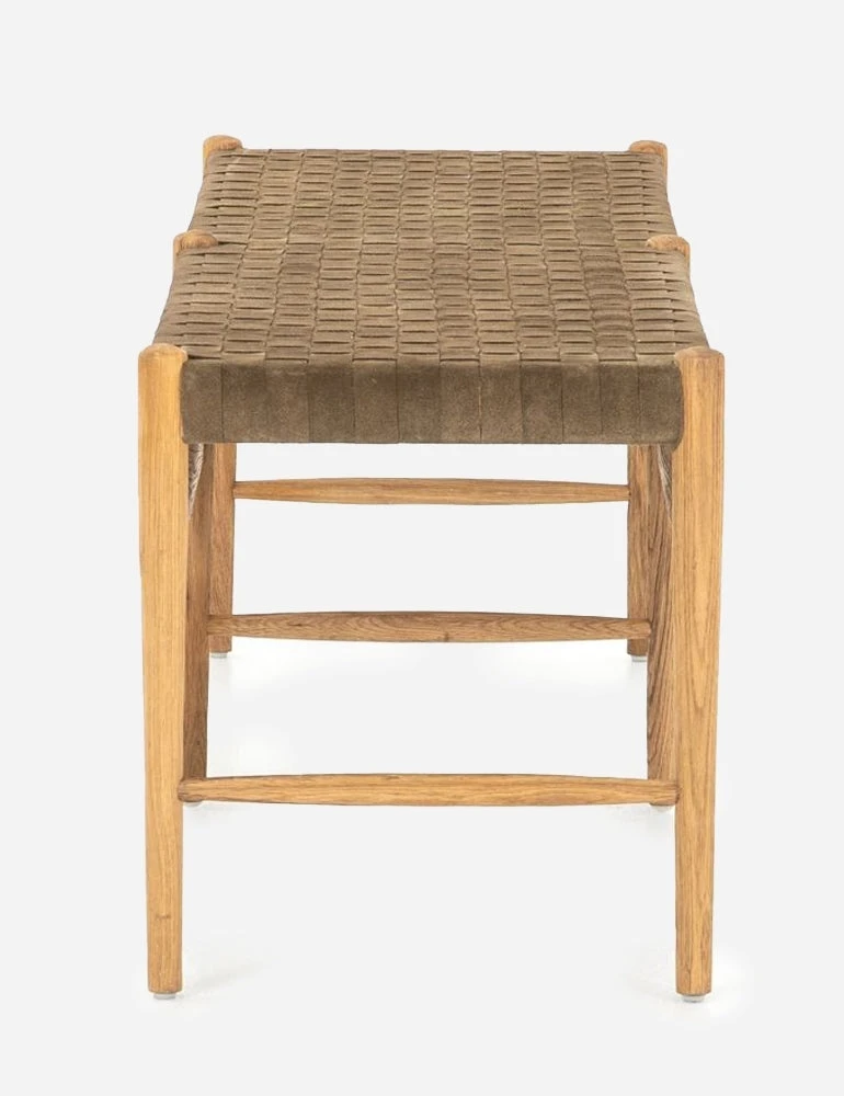 Tapered dowels give this classic bench seating a more modern look, finished in a light oak stain for a dose of natural warmth. The woven leather seat adds contrast in texture and color, and we can’t get enough.