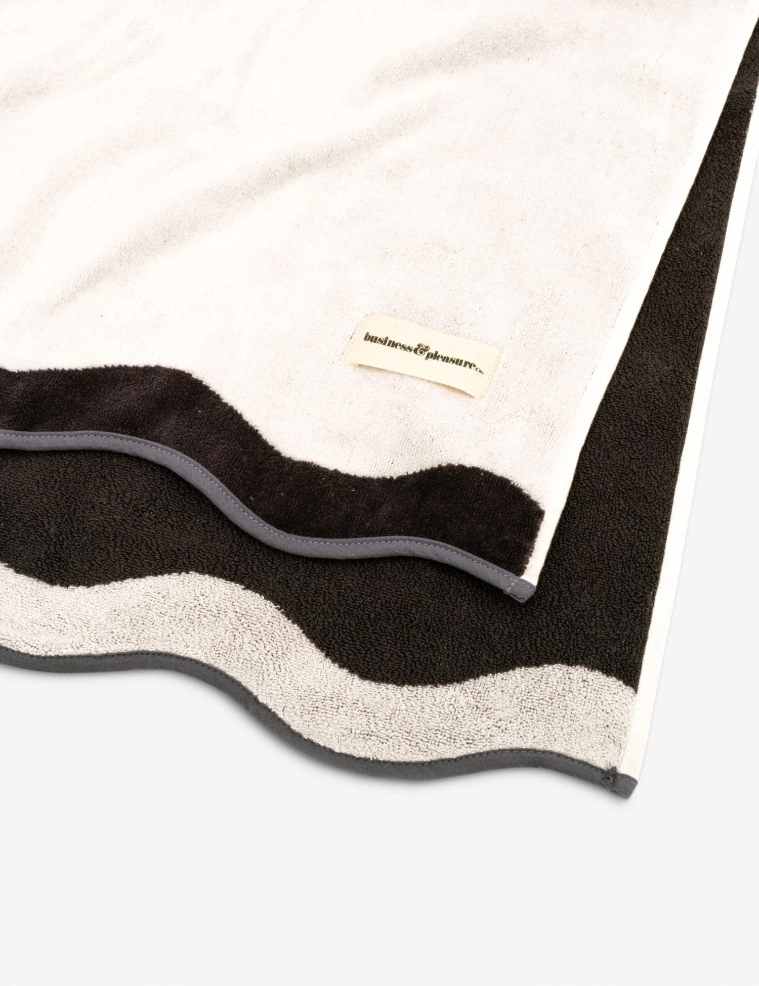 From weekend excursions to poolside hangs, this wavy beach towel offers a chic take on a summertime essential. The bold palette pops with sophistication, while accent trim sets off the towel’s playful shape. Spread out for a nap or wrap up in soft, absorbent comfort with the ultimate accessory for whimsy and leisure.