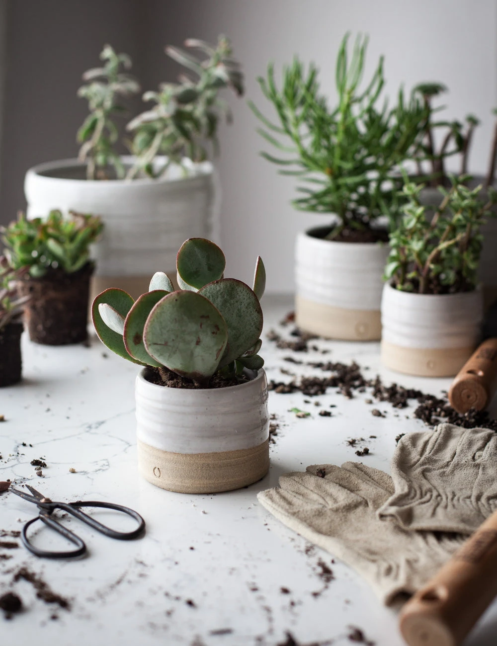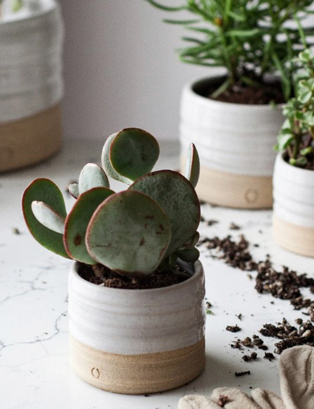 Vermont-based studio Farmhouse Pottery creates handcrafted accents and table essentials with rustic charm. With its organic lines and ringed silhouette, add a chic touch to your greenery, from kitchen counter herbs to bookshelf succulents.
