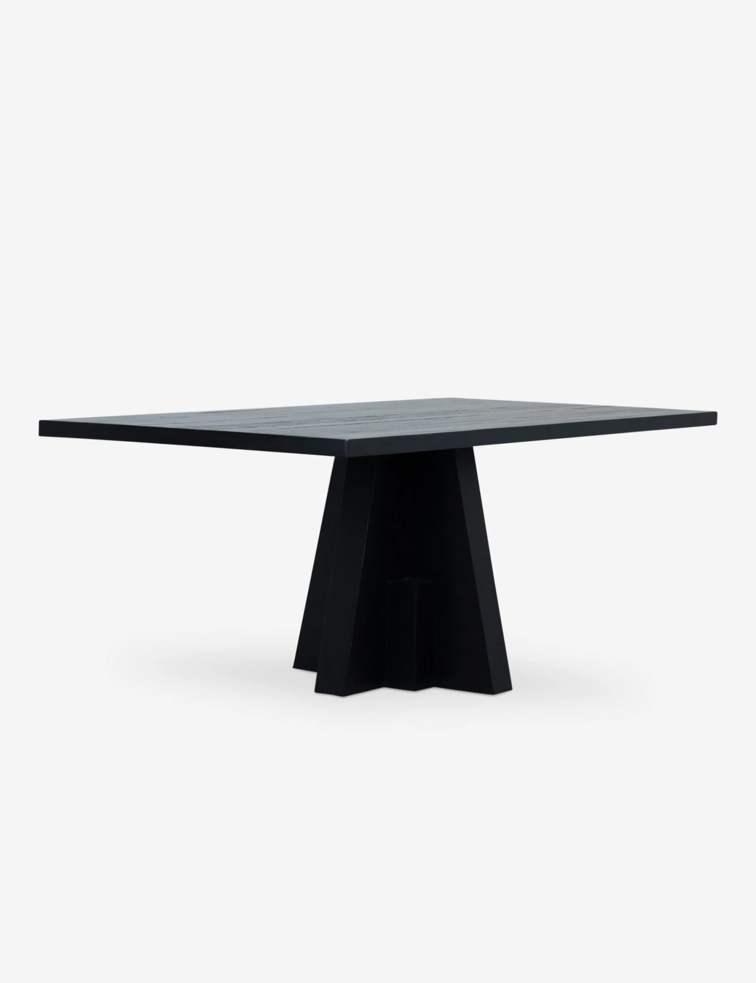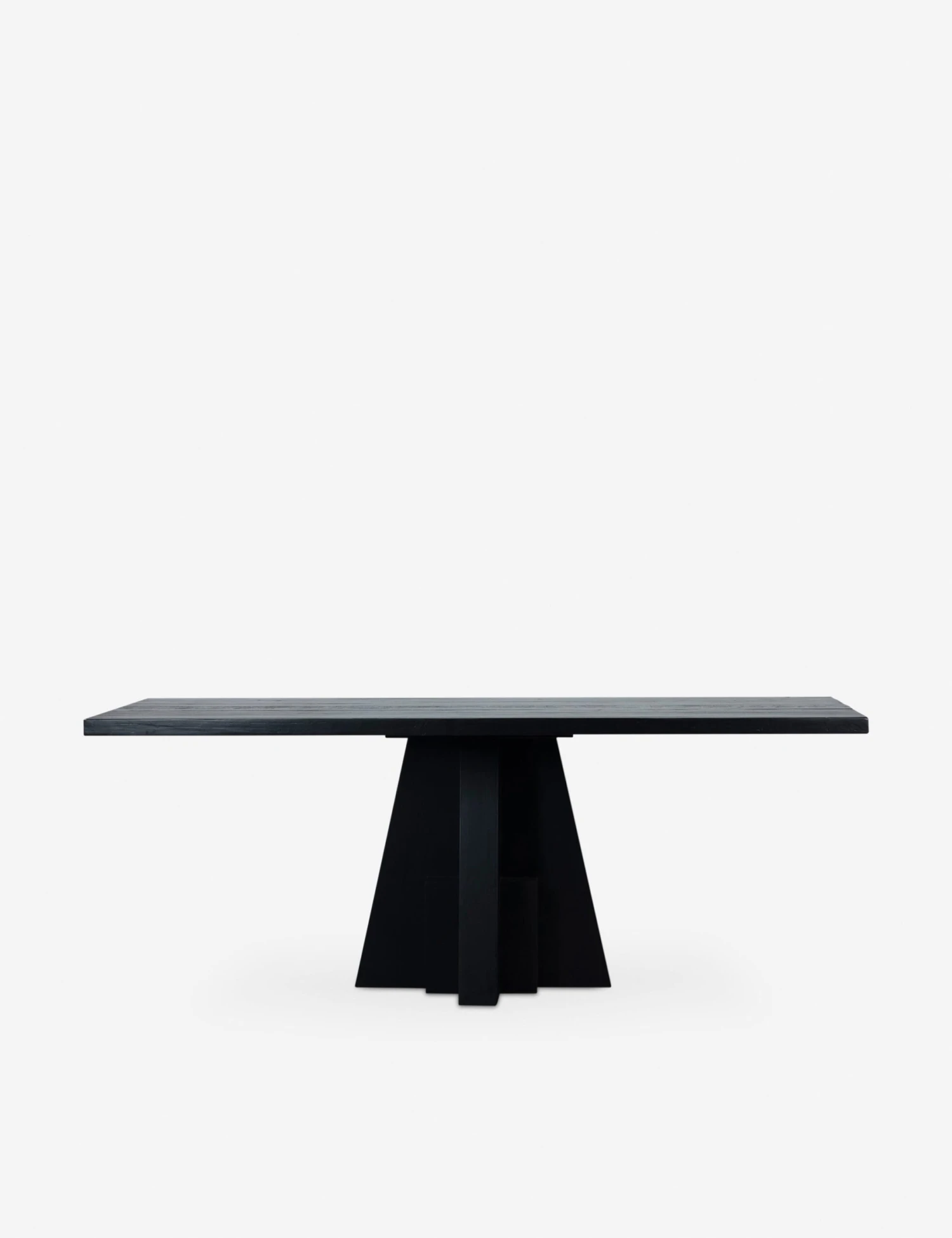 A sculptural silhouette clad in a matte black finish sets the tone for stunning impact in this unique dining room table. The pedestal base features a striking geometric design, offering deco inspiration with timeless appeal. This table is the perfect anchor for a moody aesthetic or sophisticated dining room look.